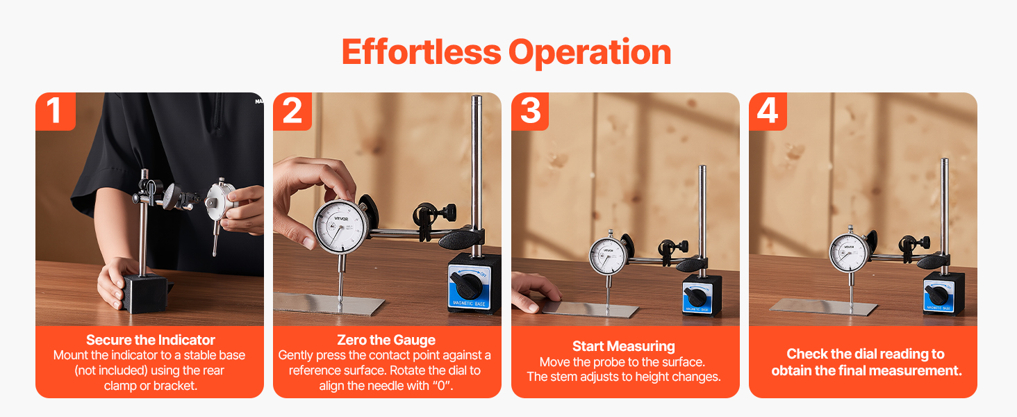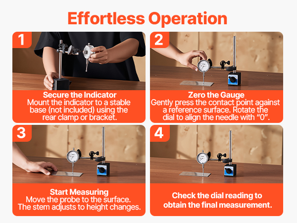 From mounting and base fixing to zeroing, measuring, and reading, this machinist dial indicator requires only four steps. Technicians and DIY users alike can master it quickly for efficient, stable, and accurate measurement.