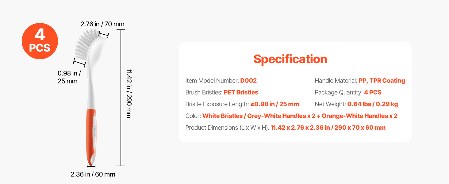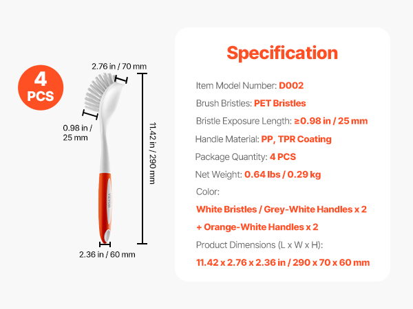 Good quality brush from Vevor. Overall length , bristles quality and ergonomic handles with TPR grip work really well for any kitchen needs. Clean & scrub all your sink , pots and pans. Came as a set of 4. No complains at all. Happy cleaning.