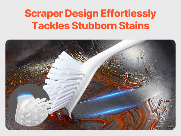 This is a fantastic kitchen tool! The ergonomic handle provides a comfortable grip, and the stiff bristles tackle tough messes with ease without losing shape. The built-in scraper is perfect for removing stubborn residue, making it a versatile tool for dishes, pots, pans, and even countertops.