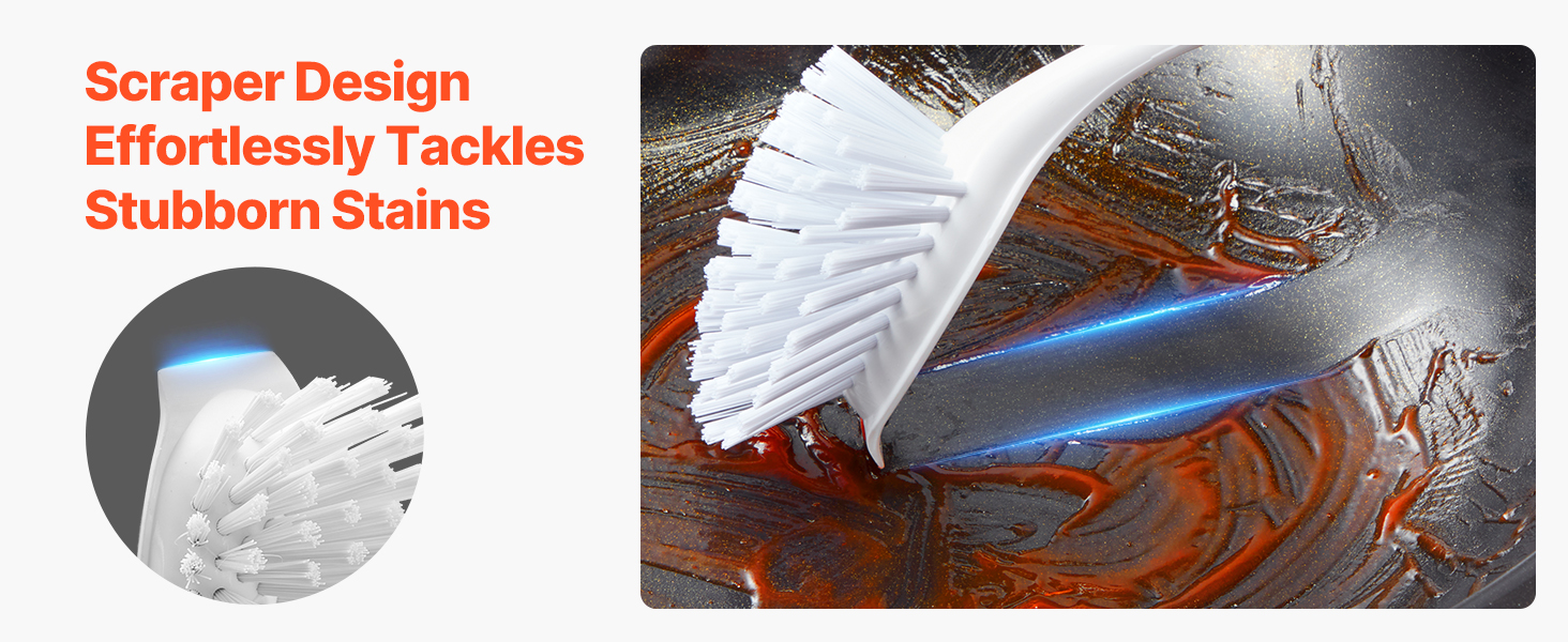 Equipped with a unique scraper design, this dish brush effortlessly removes tough stains, whether it’s dried food or greasy buildup, ensuring your dishes stay clean.