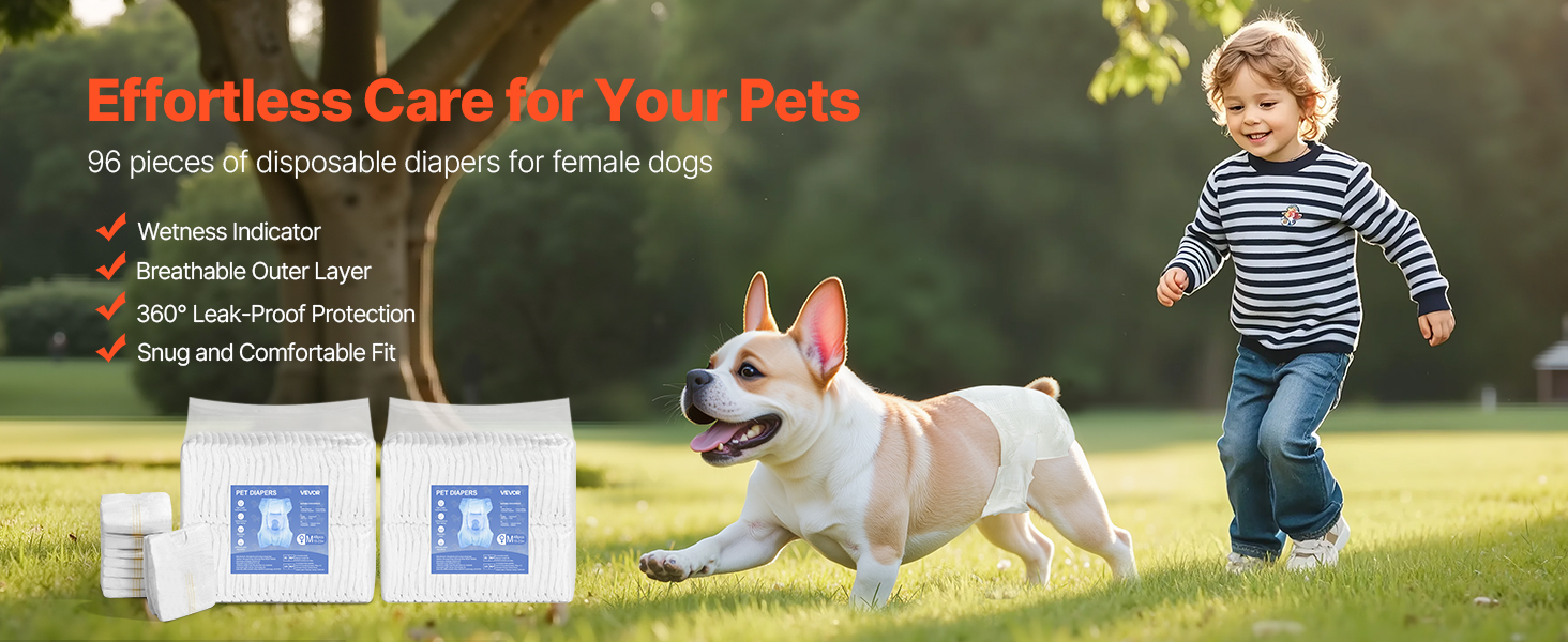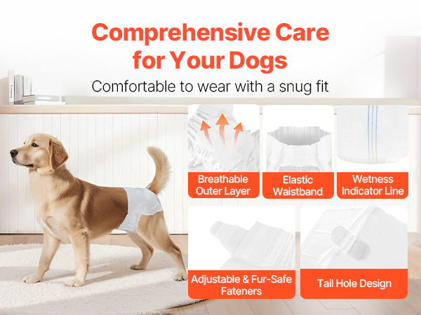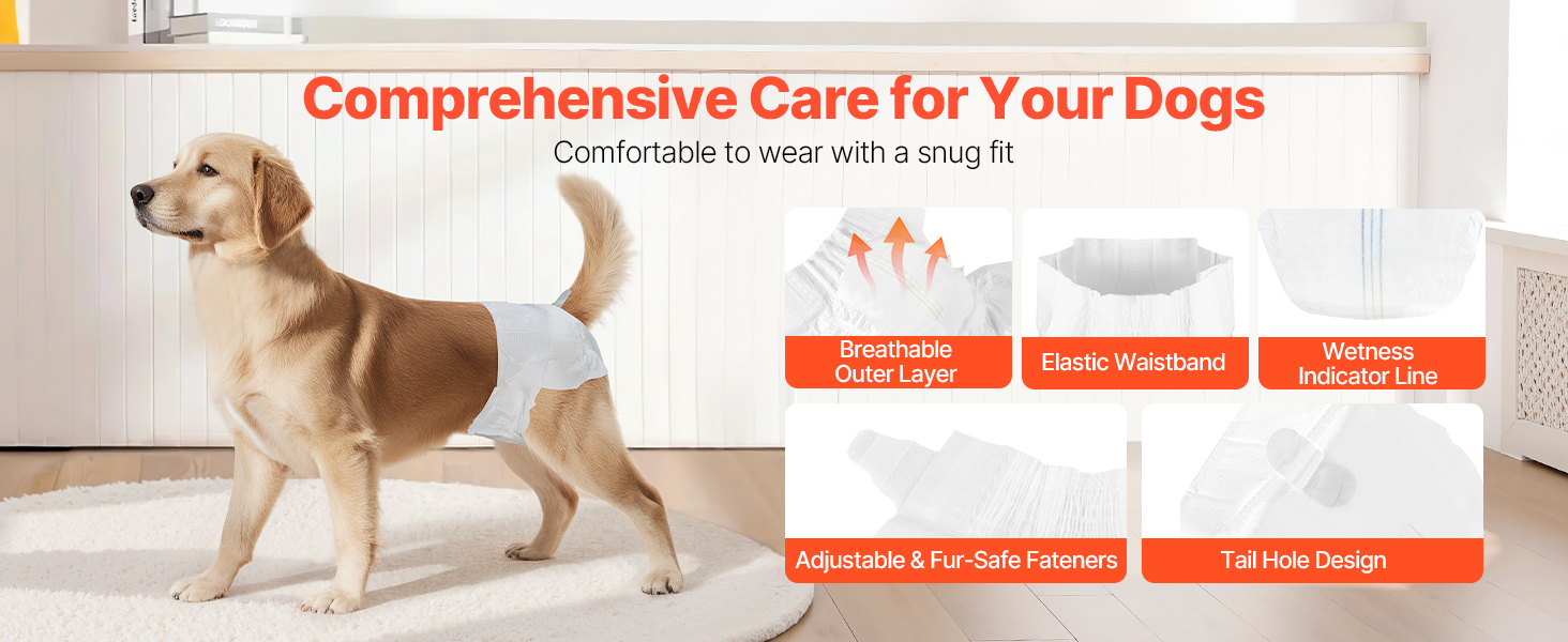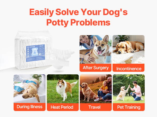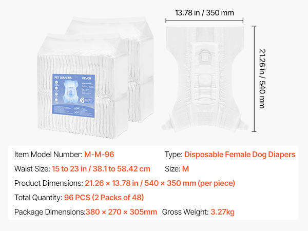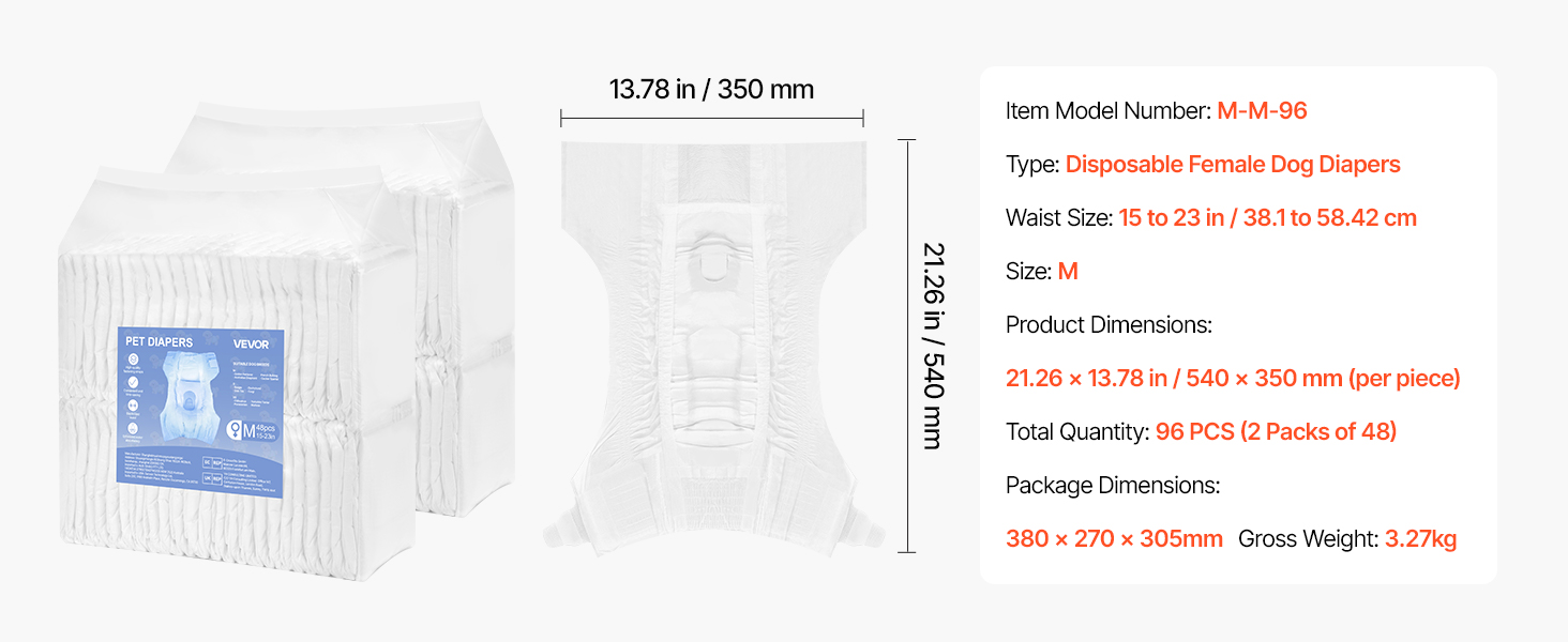 - Super Absorbent: VEVOR M-sized disposable female dog diapers feature a super absorbent core that quickly locks in liquid, offering 360° leak-proof protection with no backflow. Perfect for dogs in heat cycles, pet training, incontinence, post-surgery recovery, and travel. Suitable Waist Size: 15-23 inches / 38.1 – 58.42 cm