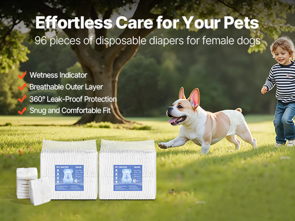 Perfect for various situations such as illness recovery, post-surgery care, senior incontinence, heat cycles, travel, and potty training. These super absorbent female dog diapers make daily pet care easier, easily solving your dog’s potty problems and giving you peace of mind.