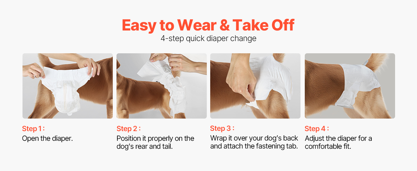 These disposable diapers for female dogs can be changed in just 4 easy steps. Whether you’re a busy pet owner or a first-time pet parent, you’ll find it quick and effortless to change your dog’s diaper, making pet care hassle-free.