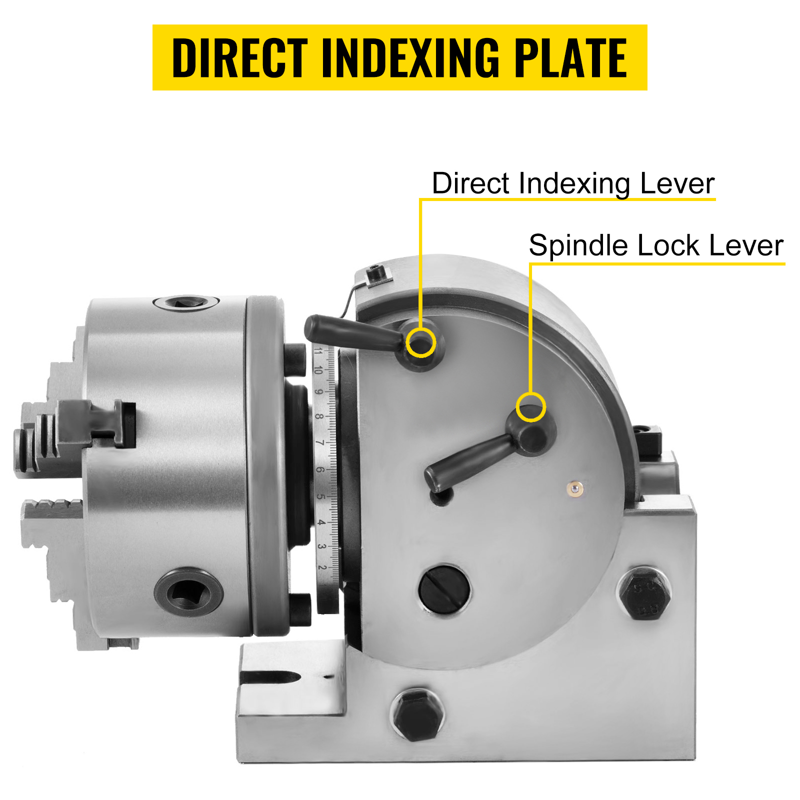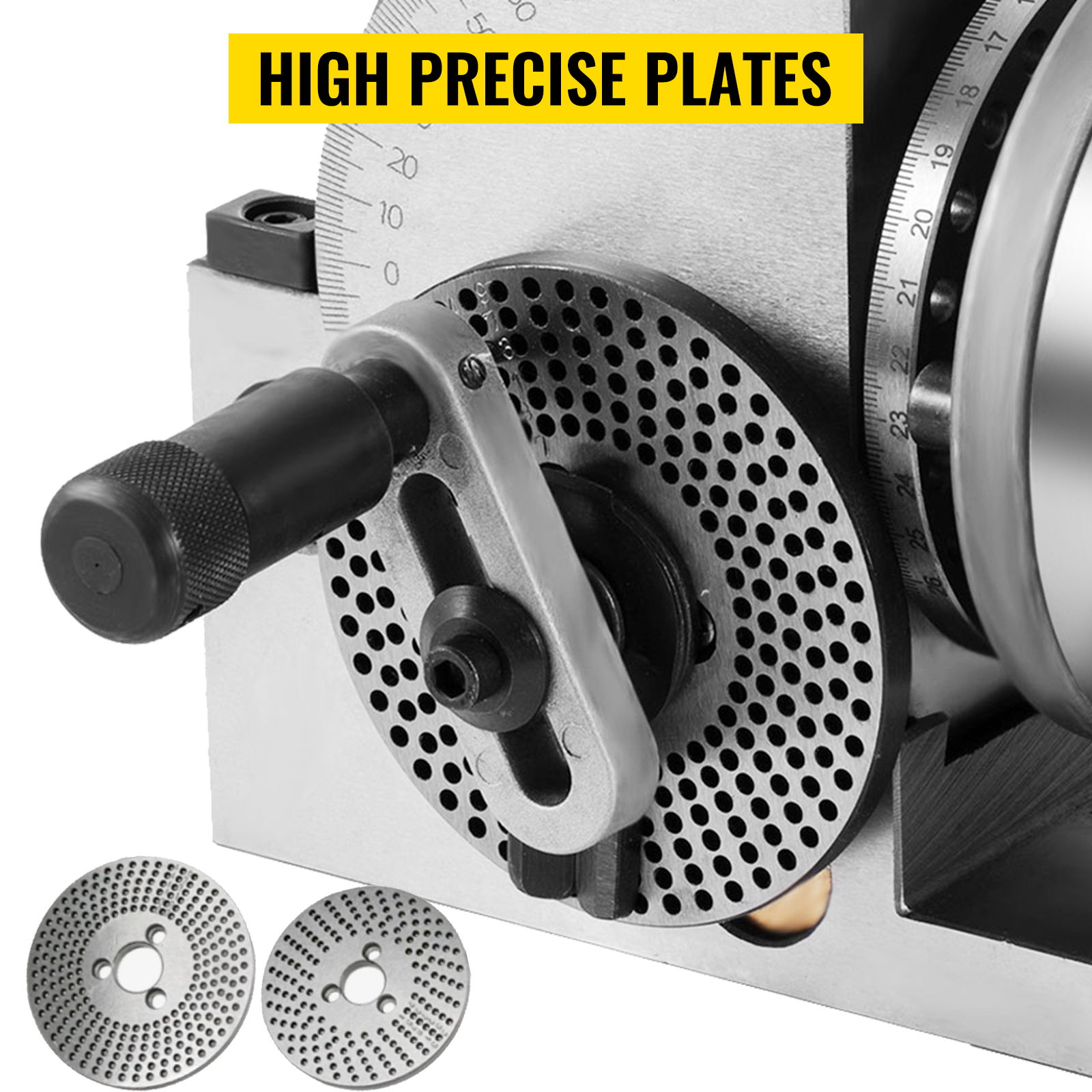 - High Precision Indexing Plate: The universal dividing head comes with a direct indexing plate and an interchangeable one on the head, and two replacement interchangeable ones with different numbers of holes. It's the dividing plates that set the precise distance between cuttings.