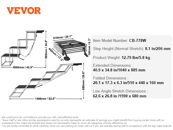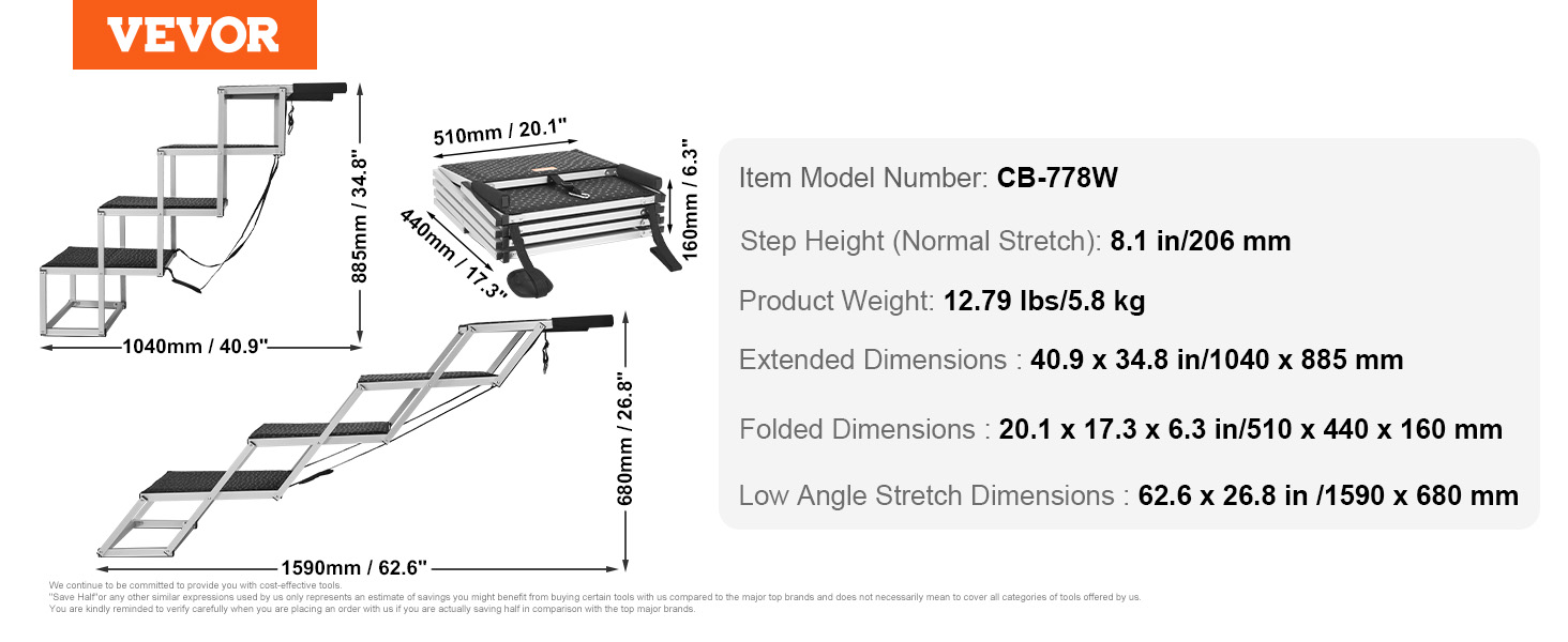 - Product Dimensions: At a normal stretch angle, the portable dog steps' length is 40.9"/1040 mm and the height is 34.8"/ 885mm. At a lower angle, the length is 62.6"/1590 mm and the height is 26.8"/680mm, making it easy for your pet to access car trunks or side doors.