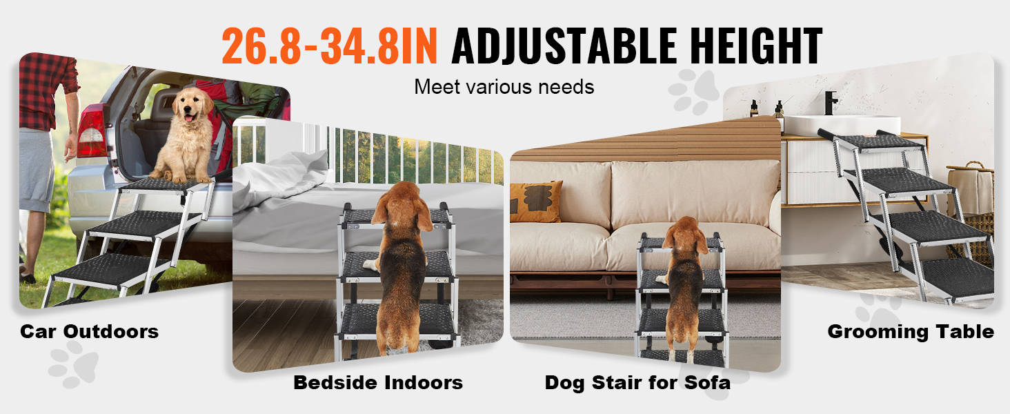 - Convenient Pet Access: The 4-step dog stair for cars adjusts in height between 26.8-34.8 in, making it ideal for small dogs, elderly pets, or injured pets to easily access car trunks, side doors, SUVs, small vans, trucks, beds, sofas, grooming or vet tables.
