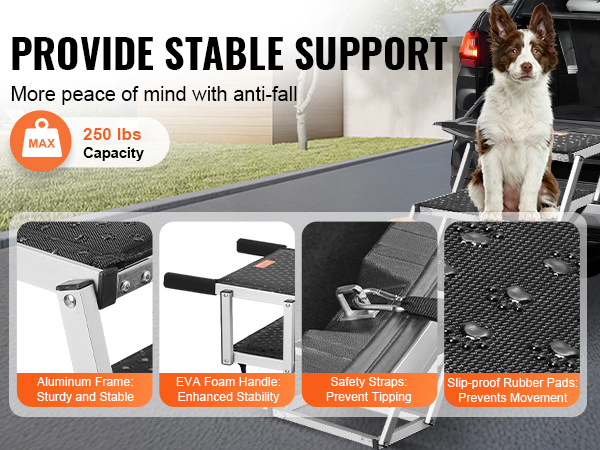 - Sturdy and Safe: Built with a sturdy aluminum alloy frame, the folding pet steps can support pets up to 250 lbs. They remain stable and do not wobble. Foam handles and safety tether clips enhance safety, preventing pets from slipping while climbing.