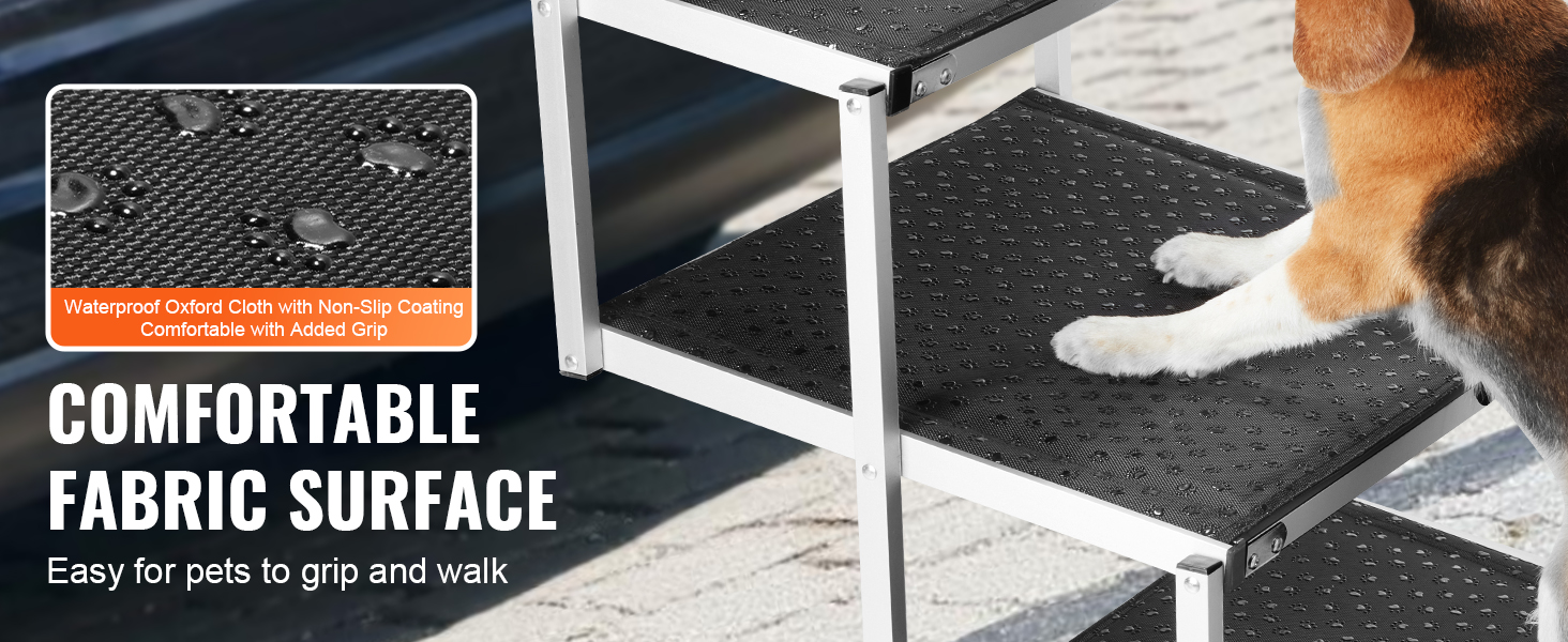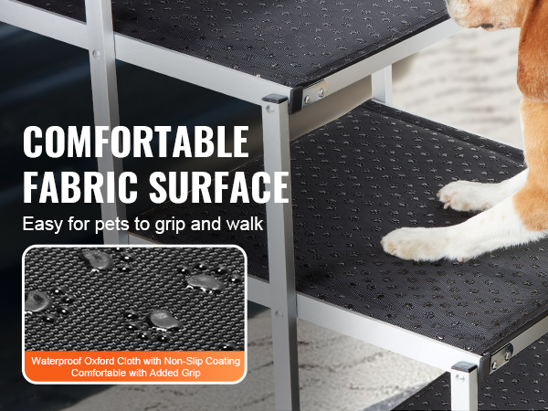 - Comfortable Stair Surface: The dog car stairs are covered with polyester fabric, providing a relaxed, non-slip surface that gives your pet's paws good traction for easier climbing. The bottom non-slip pads enhance stability and prevent pets from slipping on the ramp.