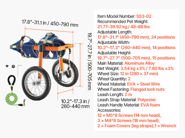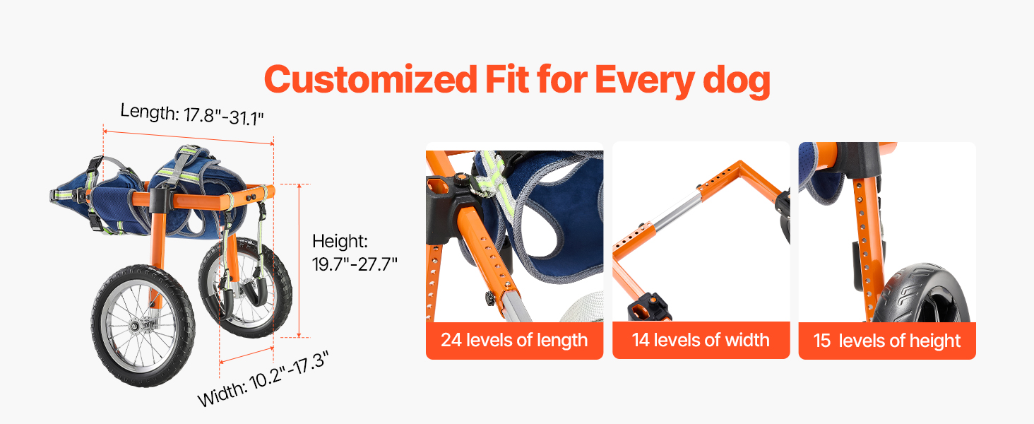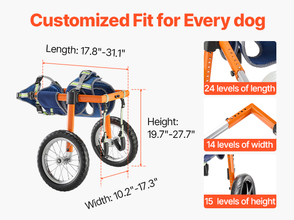 - Highly Adjustable Fit: With 18 length, 12 width, and 12 height settings, this pet wheelchair can be precisely tailored to your dog's body. Balanced support avoids leg pinching and skin irritation, ensuring a secure and comfortable fit.