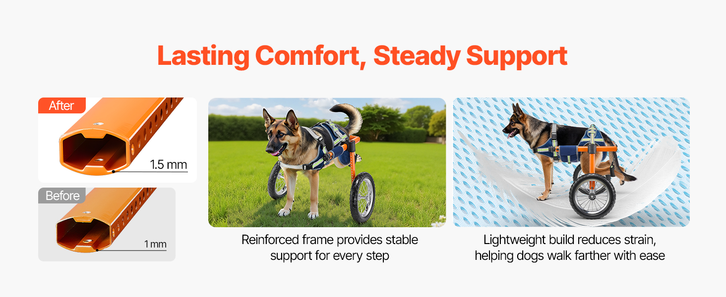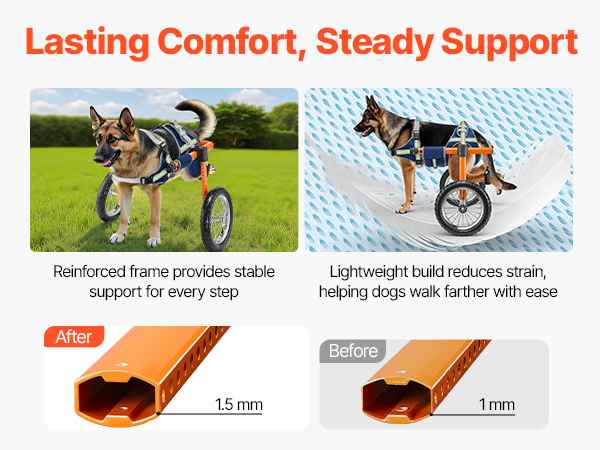 - Lightweight Yet Sturdy Frame: The dog wheelchair cart with 1.5 mm thickened frame is stronger than standard 1 mm models, reducing walking pressure while staying durable. Dogs can move freely without feeling weighed down, making longer walks effortless.