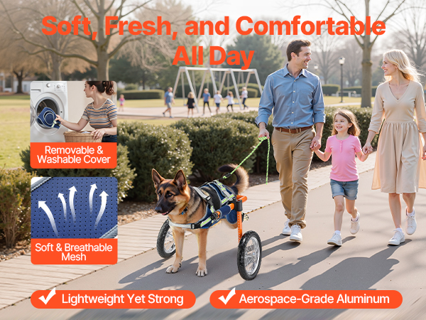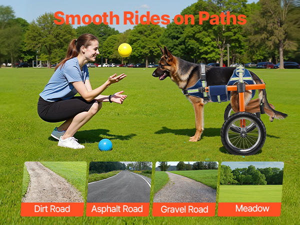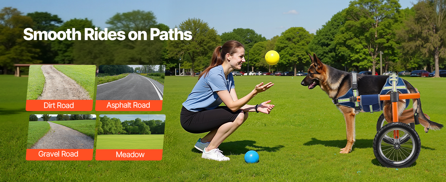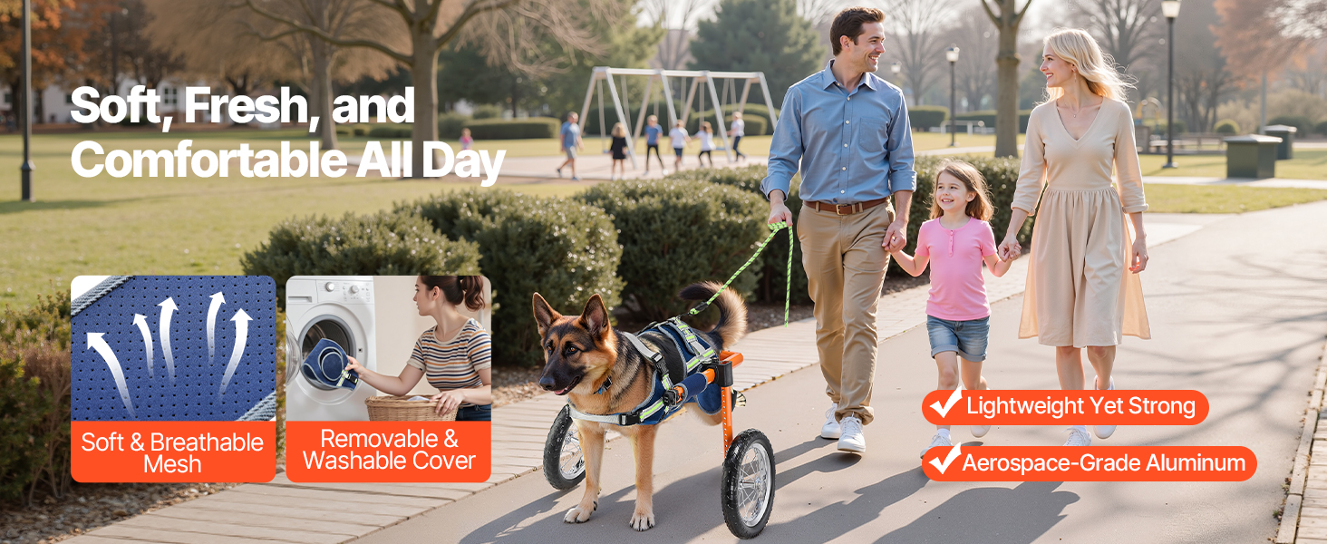 - Thoughtful for Comfort & Security: Our dog wheel chair features breathable, washable mesh that keeps dogs fresh, while shock-absorbing silent wheels with EVA treads reduce bumps. Designed to handle gravel, grass, dirt, and asphalt roads with ease.