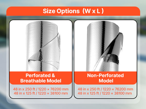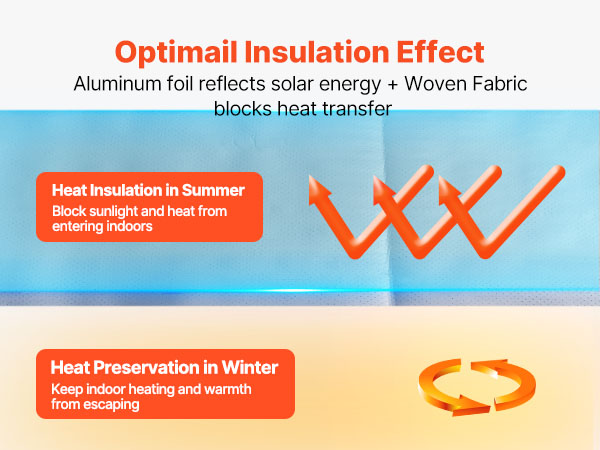VEVOR double reflective insulation roll features ≥95% high reflectivity, utilizing double reflective aluminum foil and perforated woven fabric. It blocks sunlight in summer while preventing indoor heating loss in winter, maintaining a comfortable indoor temperature.