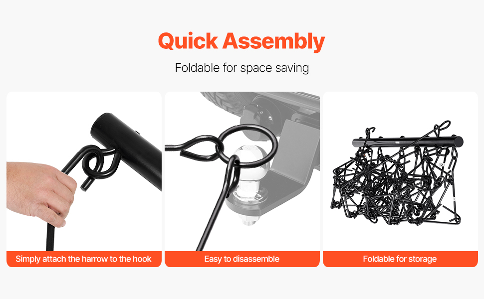 - Easy Assembly & Storage: This pull behind rake features a straightforward assembly process, allowing you to get to work quickly. After use, it folds for compact storage, saving space in your garage or tool shed and making land management more convenient.