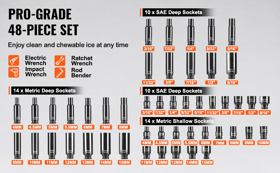 - Abundant Components: This comprehensive set includes 10pcs SAE deep sockets and 10pcs SAE shallow sockets: 3/16", 7/32", 1/4", 9/32", 5/16", 11/32", 3/8", 7/16", 1/2", 9/16"; 14pcs metric deep sockets and 14pcs metric shallow sockets: 4mm, 4.5mm, 5mm, 5.5mm, 6mm, 7mm, 8mm, 9mm, 10mm, 11mm, 12mm, 13mm, 14mm, 15mm.