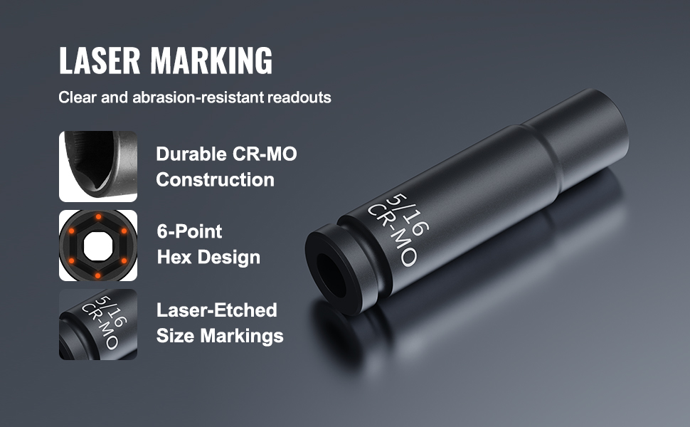 Using laser etching and rolling processes, the extra-large size markings on the sockets are clear and easy to identify even under various lighting conditions. The markings are also resistant to wear.