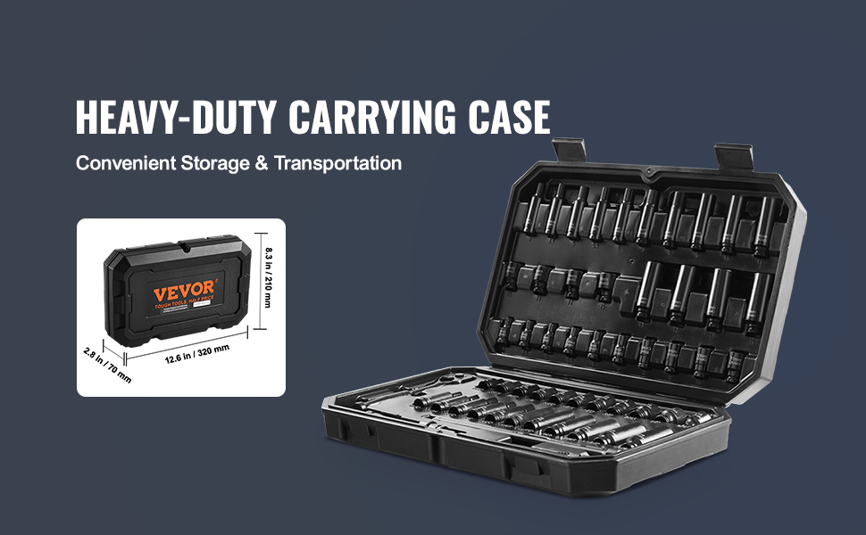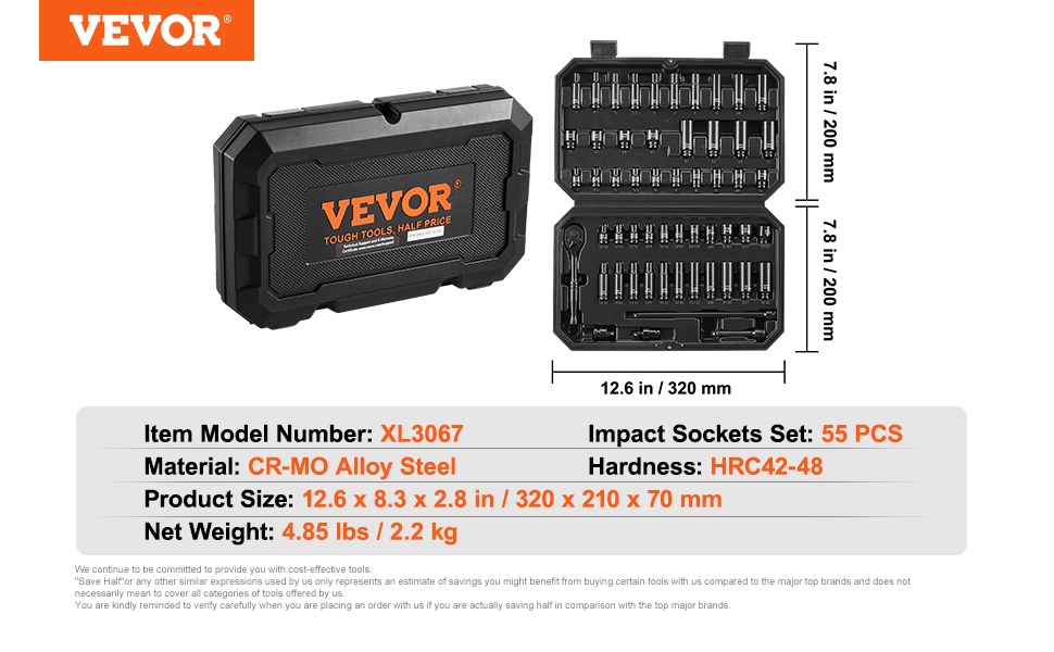Are you looking for a professional and portable set of impact sockets? VEVOR’s 55-piece impact socket set offers a complete range of tools, especially suitable for repairing different brands of automobiles.