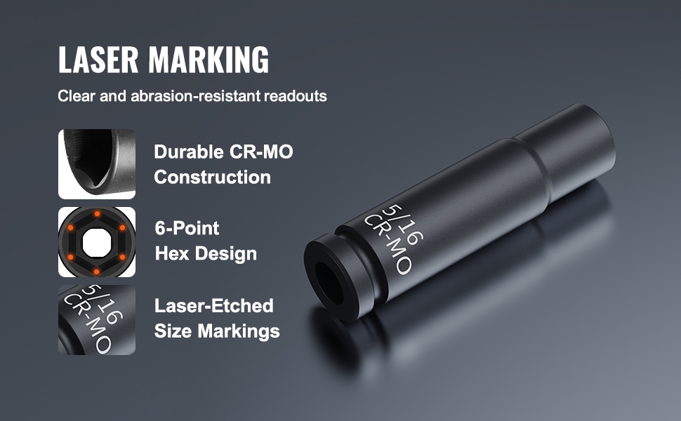 Using laser etching and rolling processes, the extra-large size markings on the sockets are clear and easy to identify even under various lighting conditions. The markings are also resistant to wear.