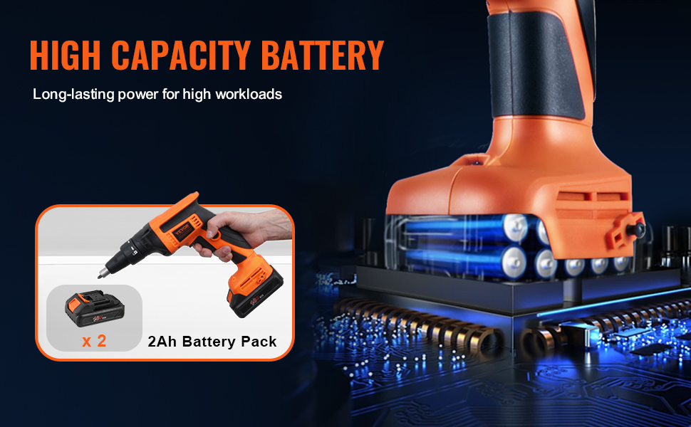 - Extended Battery Life: Each drywall gun comes with 2 x 2AH battery packs, fully charged in just 1 hour and 15 minutes. A single fully charged battery pack can drive 800 screws, eliminating the need for frequent charging interruptions. It is ideal for large projects or prolonged operations.