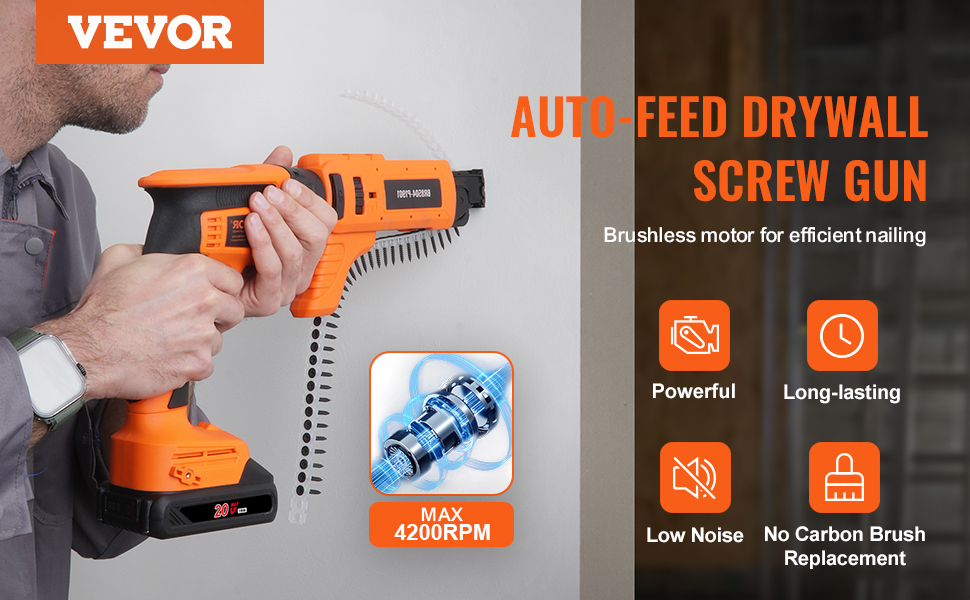 - Ultimate Efficiency: The auto-feed drywall screw gun enables single-handed operation for quick nailing. It features a high-efficiency brushless motor with a speed of up to 4200RPM, providing exceptional power, long-lasting lifespan, and ensuring smooth, effortless operation while reducing noise levels. You won't even need to replace carbon brushes.