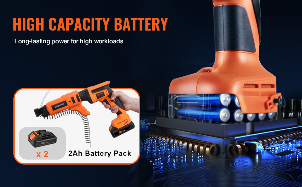 Each drywall gun is equipped with two 2AH battery packs, capable of driving 800 screws on a single charge, providing excellent working time and efficiency. This allows it to handle high workload tasks with ease, without the need for frequent charging or battery replacements.