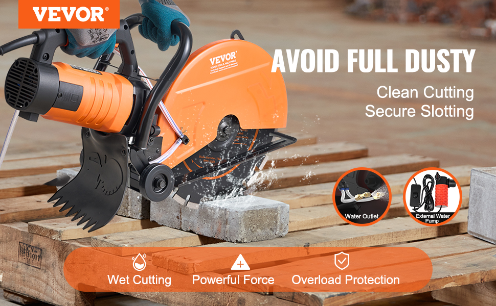 - A Clean Wet Cut: The VEVOR electric concrete saw delivers an improved cutting experience and minimizes operator fatigue by preventing debris dispersion during cutting operations. It also features a wet-cutting attachment, which enables direct water spraying and eliminates the need for one-handed watering while cutting. This enhances operational safety and simplifies the cutting process.