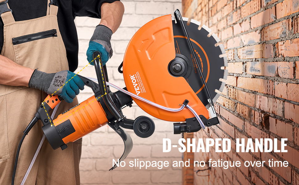 The concrete cutting saw has a scientifically optimized weight distribution thanks to its D-shaped handle. The handle also features a non-slip surface, preventing it from easily slipping and causing fatigue during extended use.