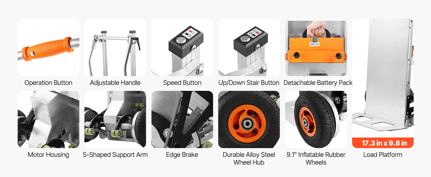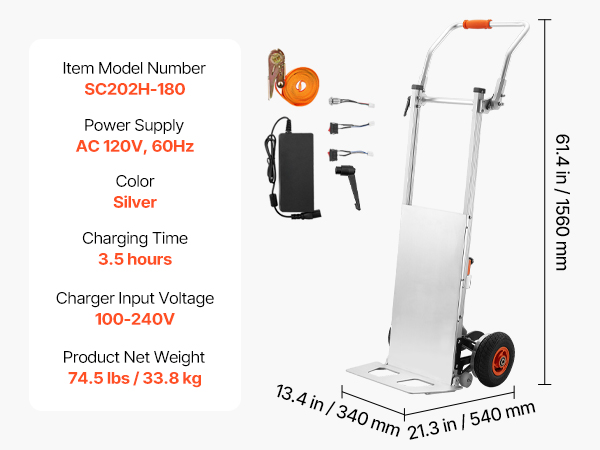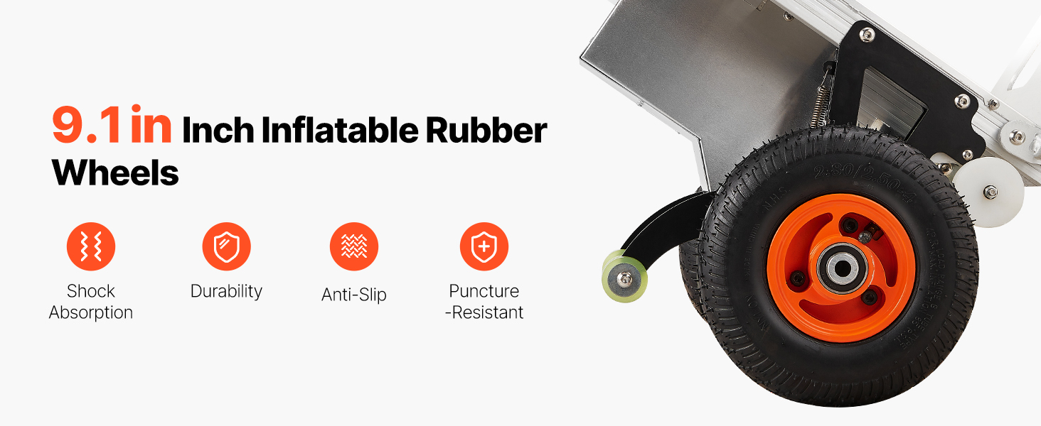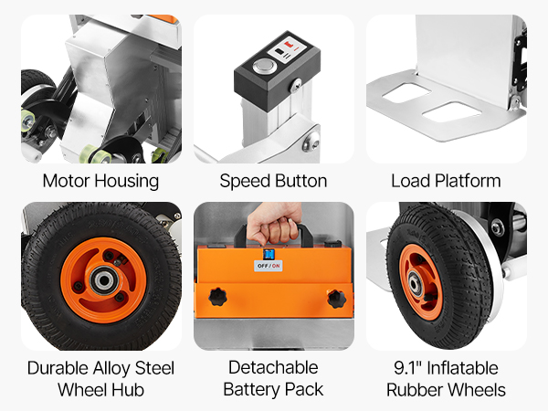 - Versatile for Different Surfaces: This electric hand truck is equipped with two 2.4in anti-slip inflatable wheels, making it easy to use on all surfaces. Ideal for transporting building materials, office supplies, appliances, industrial equipment, logistics, and beverage packaging.