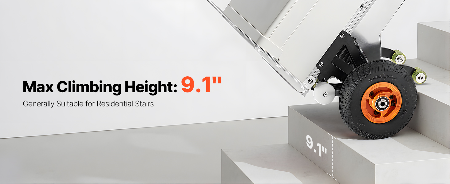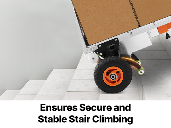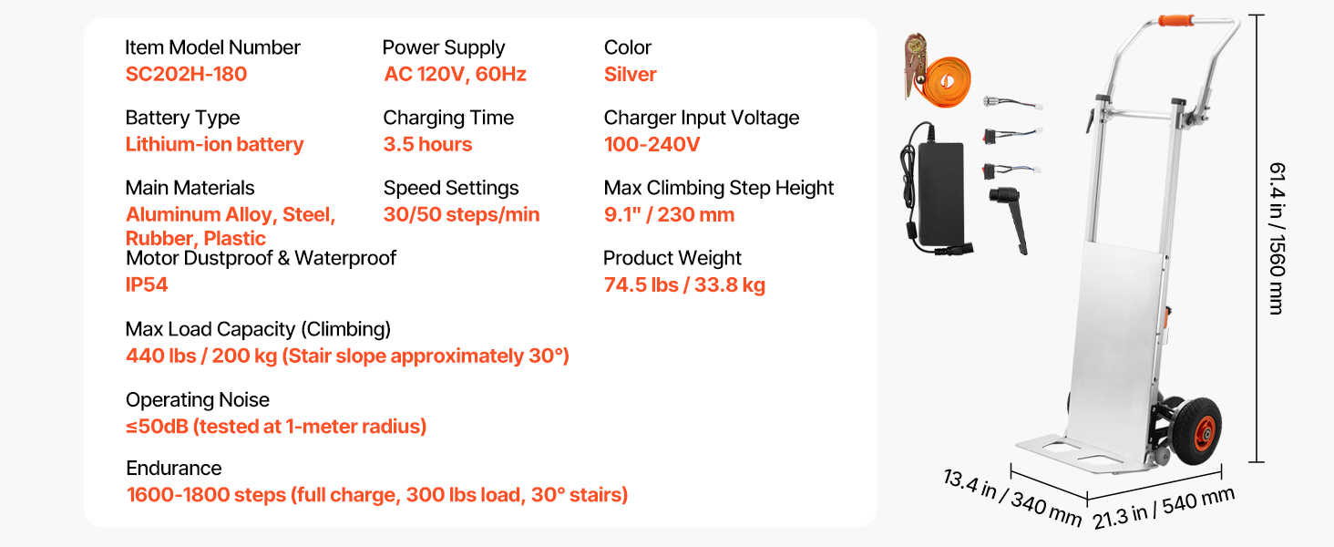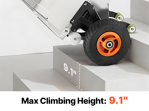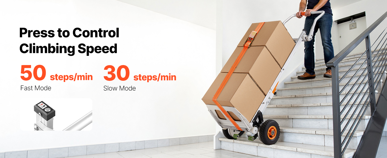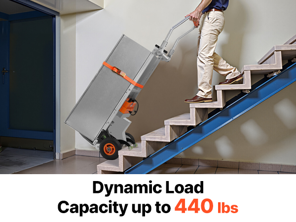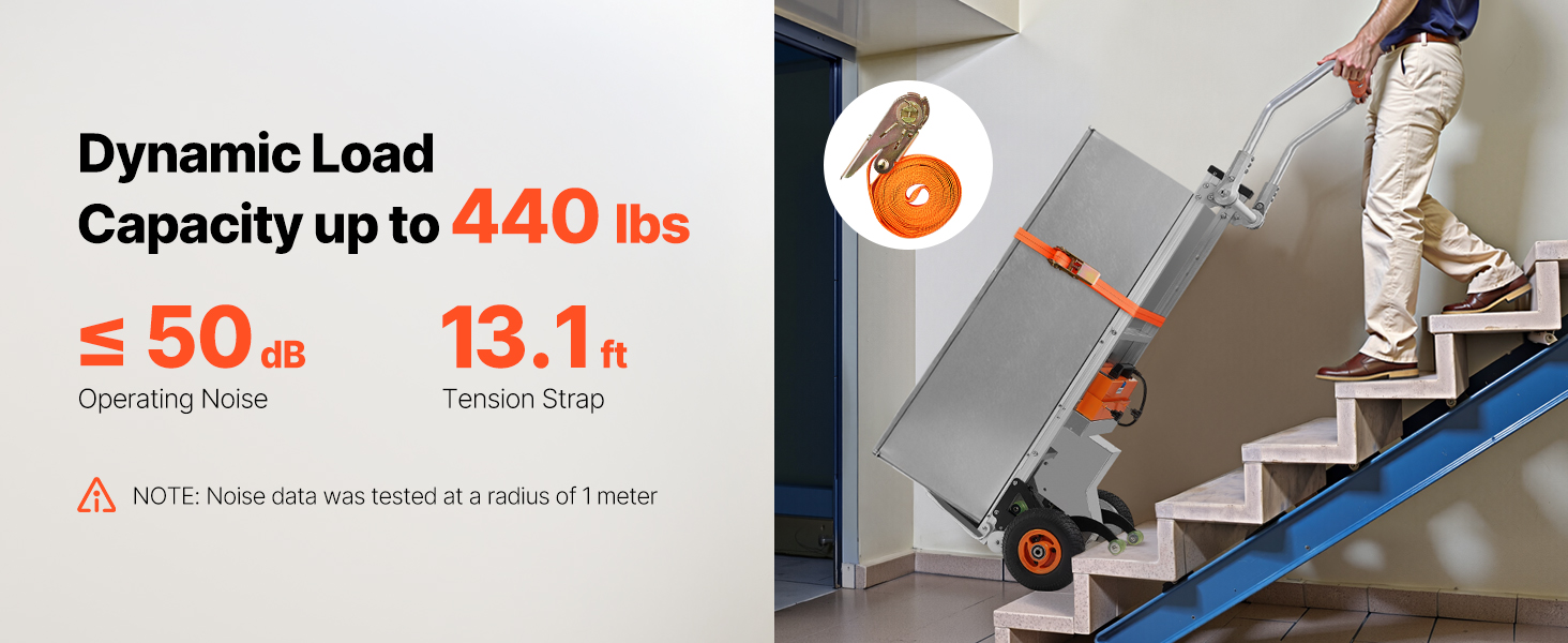- Effortless Moving Helper: This electric stair climber has a max load capacity of 440lbs (200kg) and easily handles heavy loads up and down stairs. It supports slopes up to 30° and stair heights up to 9.1" (230mm). With two speed settings: fast at 50 steps/min and slow at 30 steps/min, and noise level ≤50dB (at 1m). For large items, two people are recommended for secure handling.