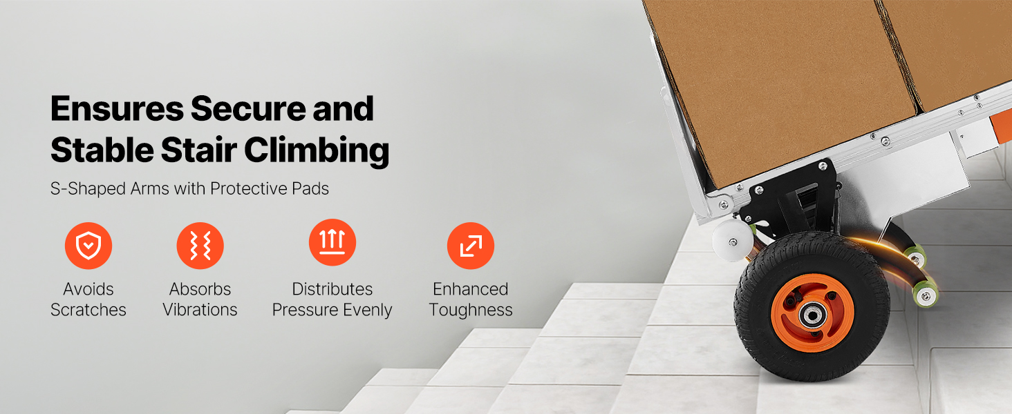 A: Yes, it works on carpeted stairs if the carpet is securely fixed. It’s also suitable for wooden, concrete, and metal stairs, both indoors and outdoors, with protective pads to avoid scratching.