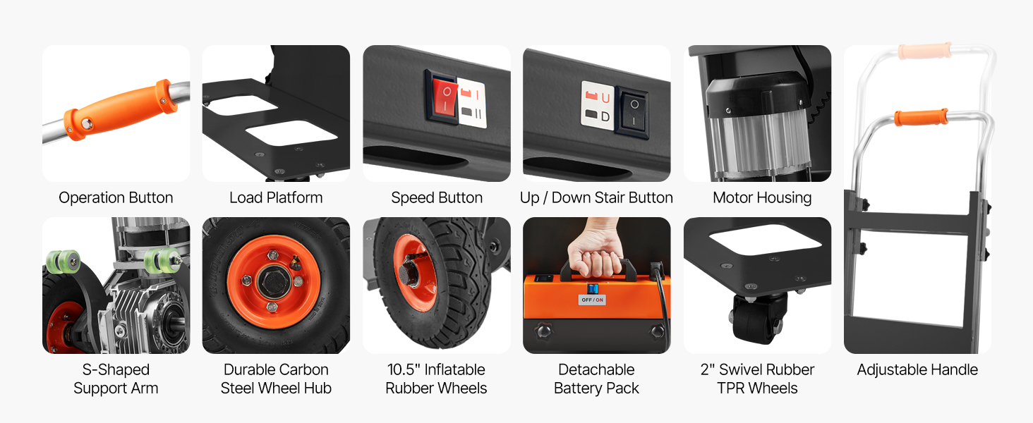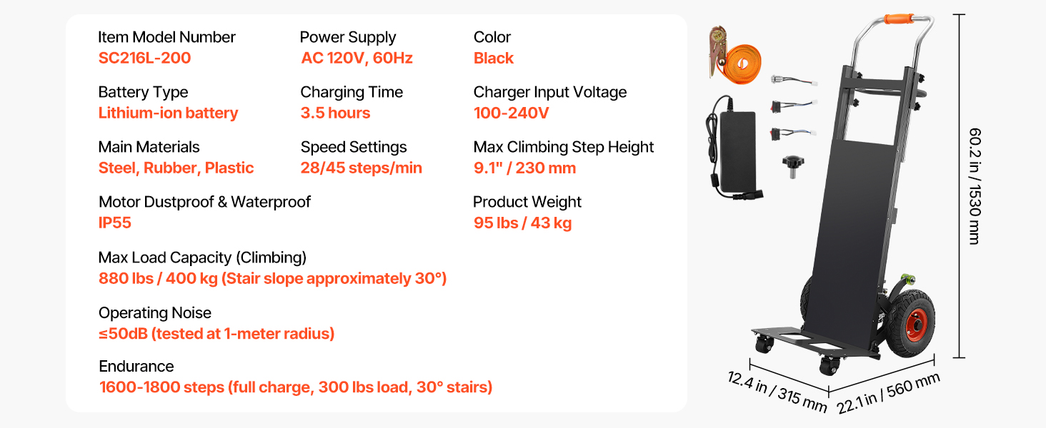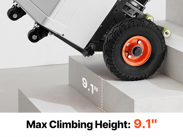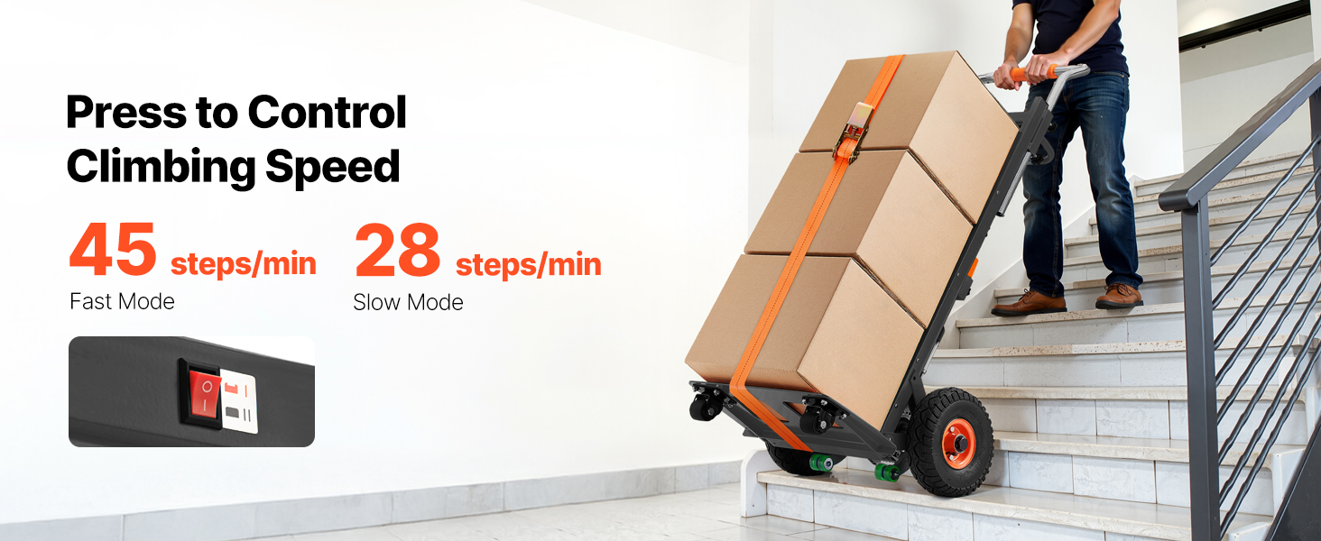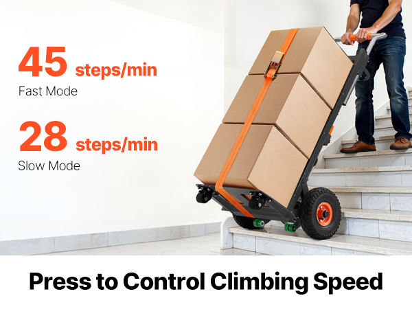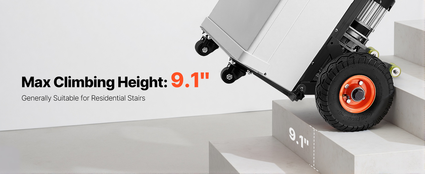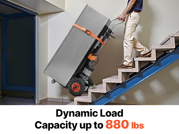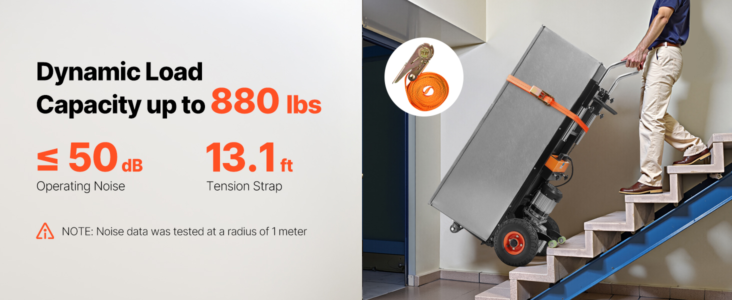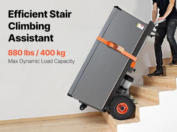 - Effortless Moving Helper: This electric stair climber has a max load capacity of 880lbs (400kg) and easily handles heavy loads up and down stairs. It supports slopes up to 30° and stair heights up to 9.1" (230mm). With two speed settings: fast at 45 steps/min and slow at 28 steps/min, and noise level ≤50dB (at 1m). For large items, two people are recommended for secure handling.