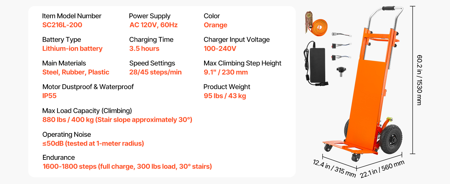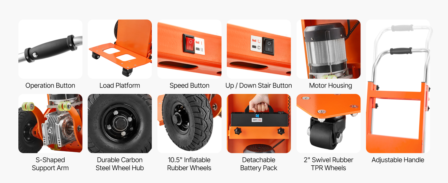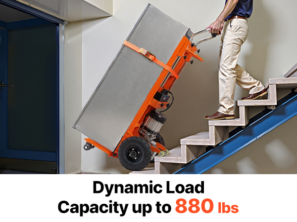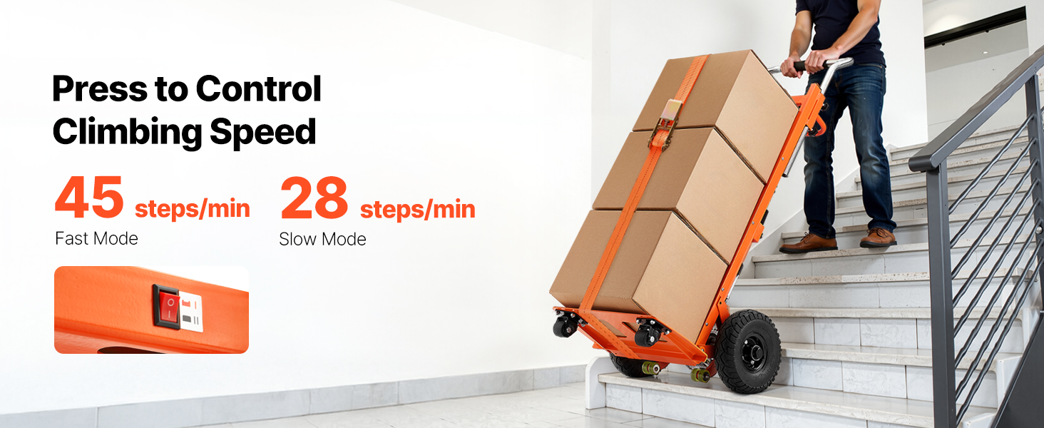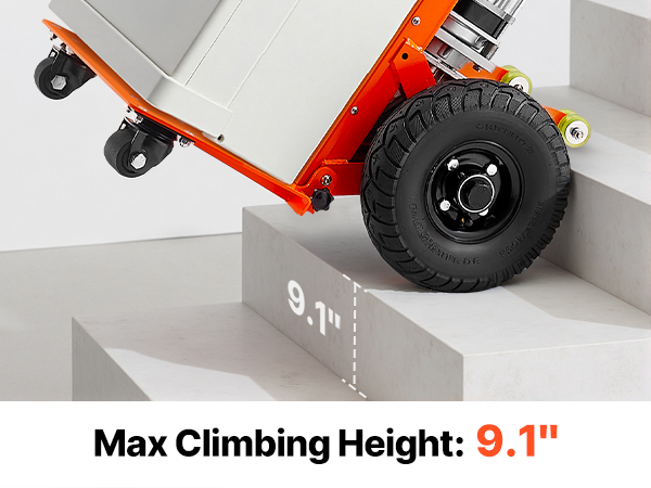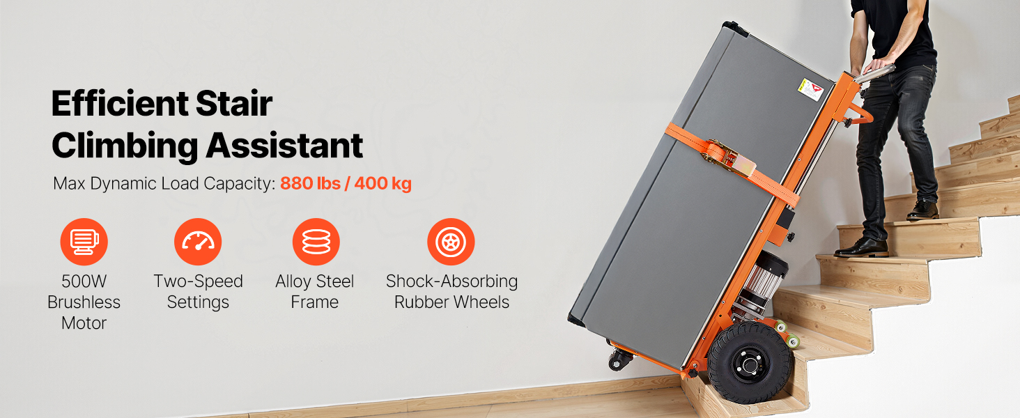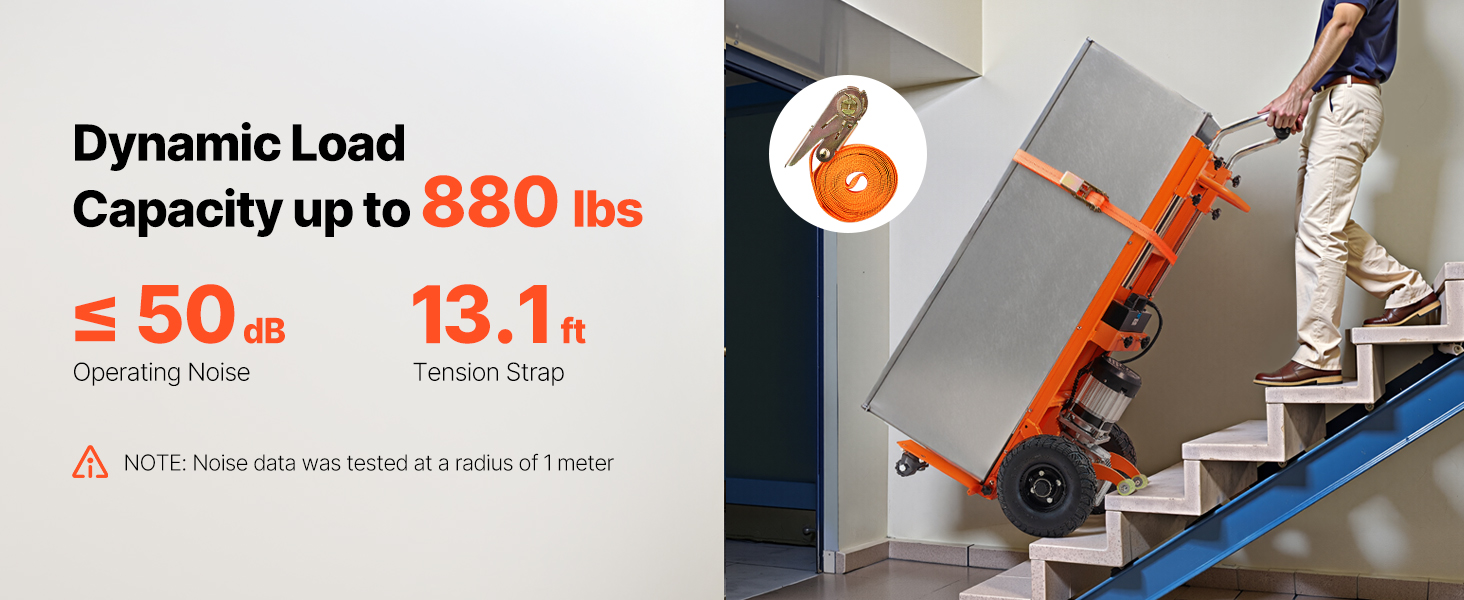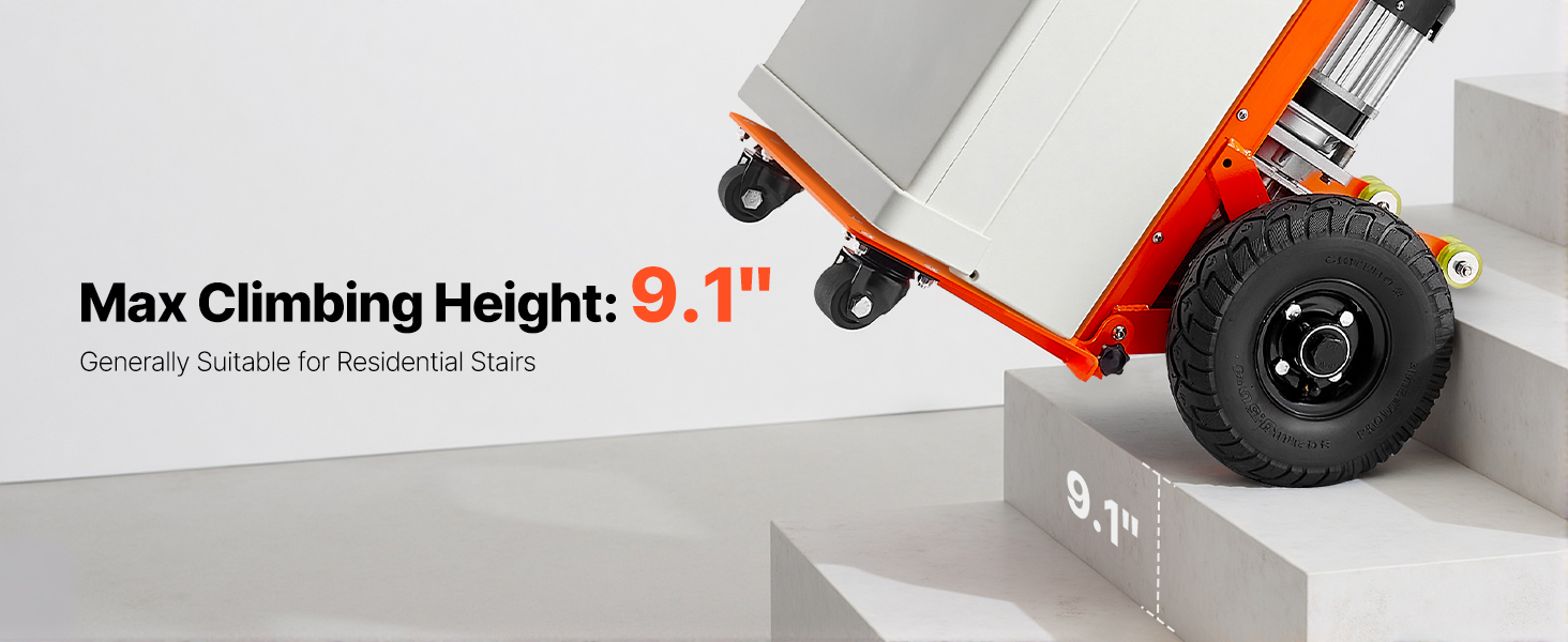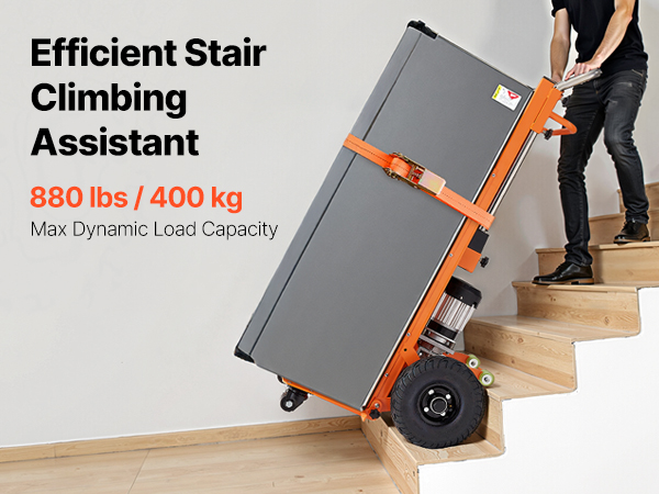 - Effortless Moving Helper: This electric stair climber has a max load capacity of 880lbs (400kg) and easily handles heavy loads up and down stairs. It supports slopes up to 30° and stair heights up to 9.1" (230mm). With two speed settings: fast at 45 steps/min and slow at 28 steps/min, and noise level ≤50dB (at 1m). For large items, two people are recommended for secure handling.