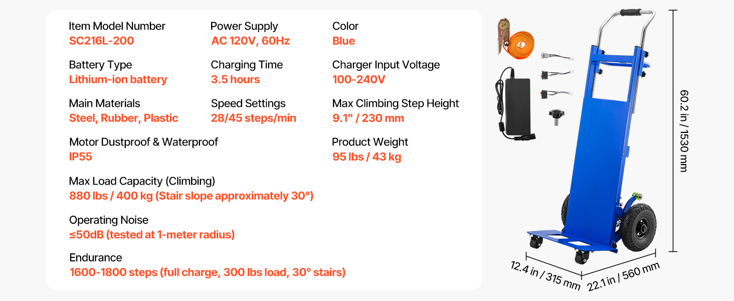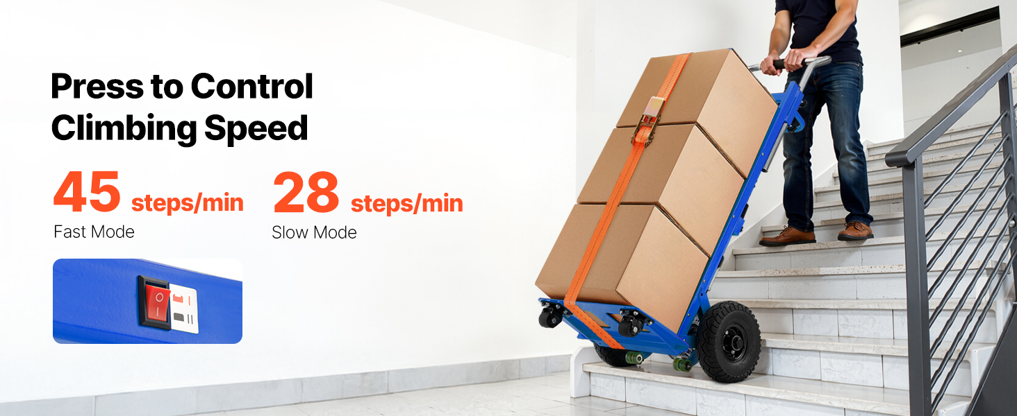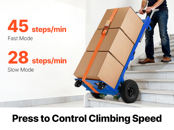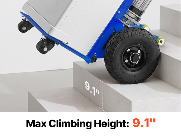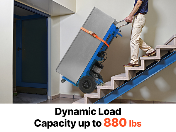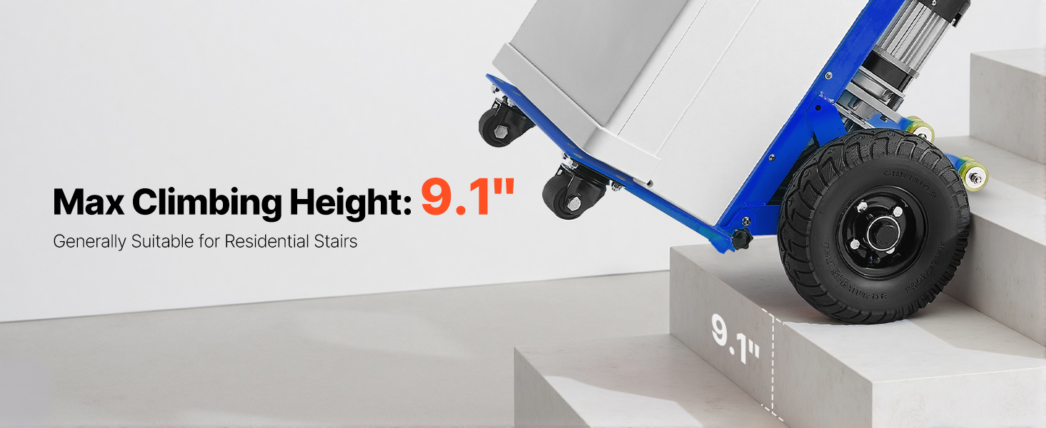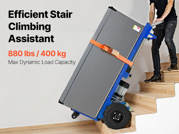 - Effortless Moving Helper: This electric stair climber has a max load capacity of 880lbs (400kg) and easily handles heavy loads up and down stairs. It supports slopes up to 30° and stair heights up to 9.1" (230mm). With two speed settings: fast at 45 steps/min and slow at 28 steps/min, and noise level ≤50dB (at 1m). For large items, two people are recommended for secure handling.