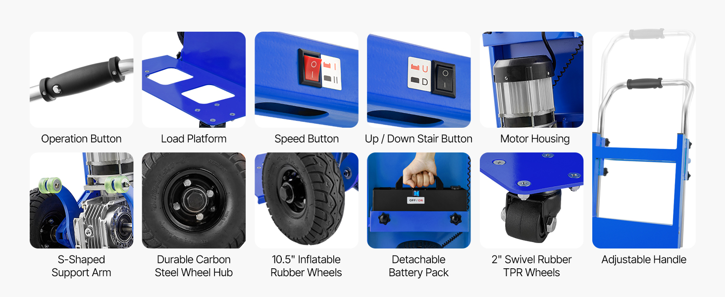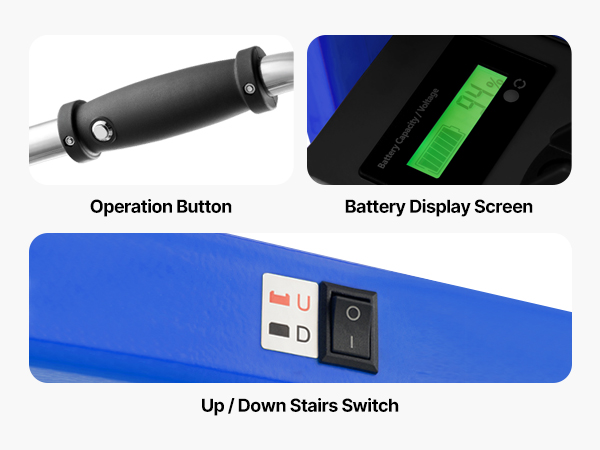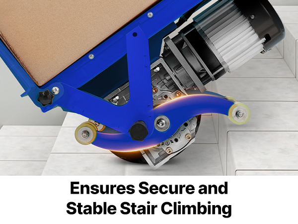 - Built for Long-Term Use: This electric stair climbing weighs 95 lbs, making it easy to store. It features a 4mm thick alloy steel frame, durable and deformation-resistant. The paint-grade storage platform is wear-resistant with strong load capacity. The S-shaped support arm is reinforced for stability and speed, with a ground protection design to avoid damage to stair surfaces. CE certified, ensuring reliable quality.