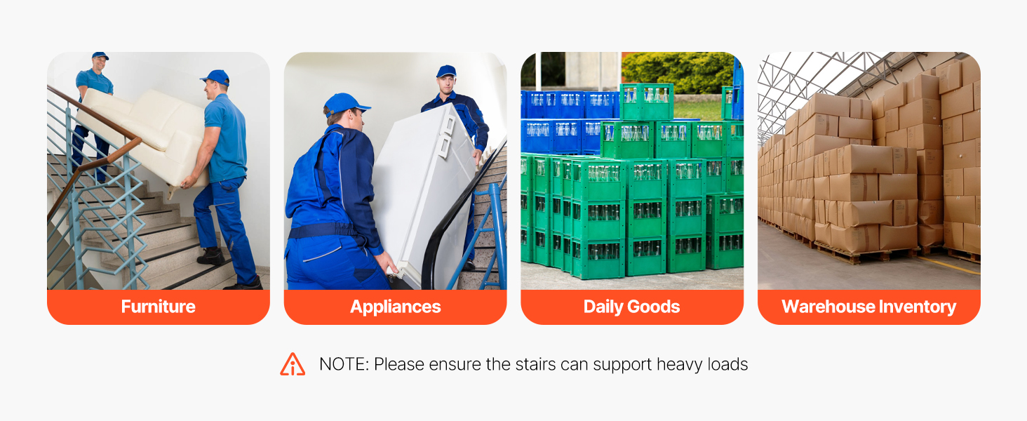 A: The operator should be physically fit and must control the direction of the trolley at the top, whether going up or down stairs. When moving large items like furniture, refrigerators, or washing machines, it’s recommended to have two people: one controls the trolley, and the other supports the load to keep it stable.
