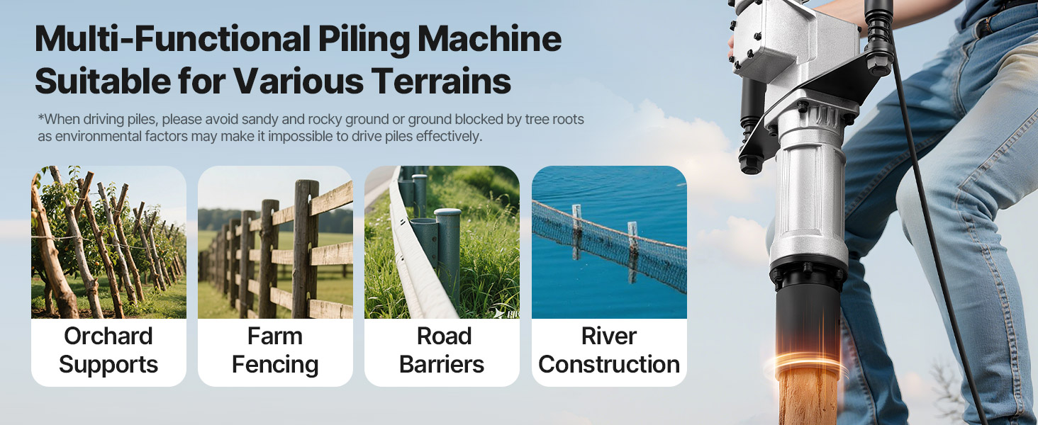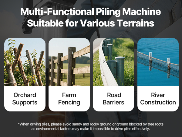 - Wide Application: This fence post driver is ideal for orchard trellis installation, farm fencing, road renovations, and riverbank construction, as well as installing fence posts. NOTE: Avoid sandy, rocky, or root-filled ground for effective piling.