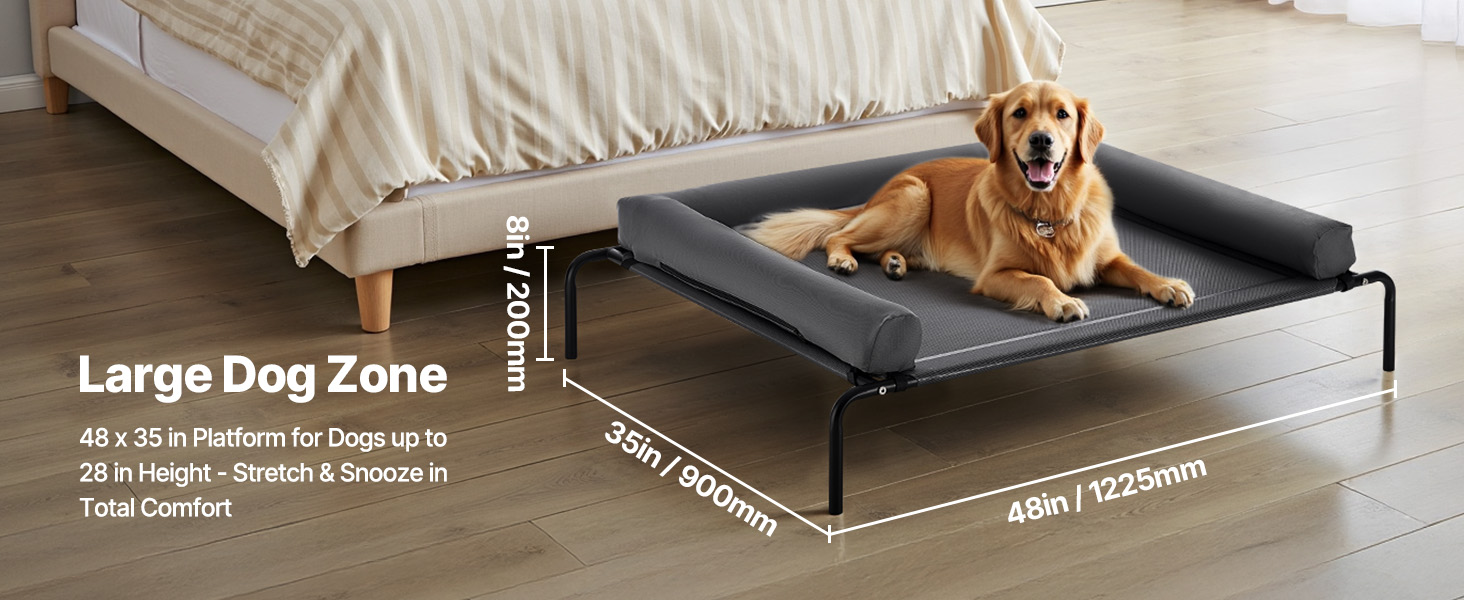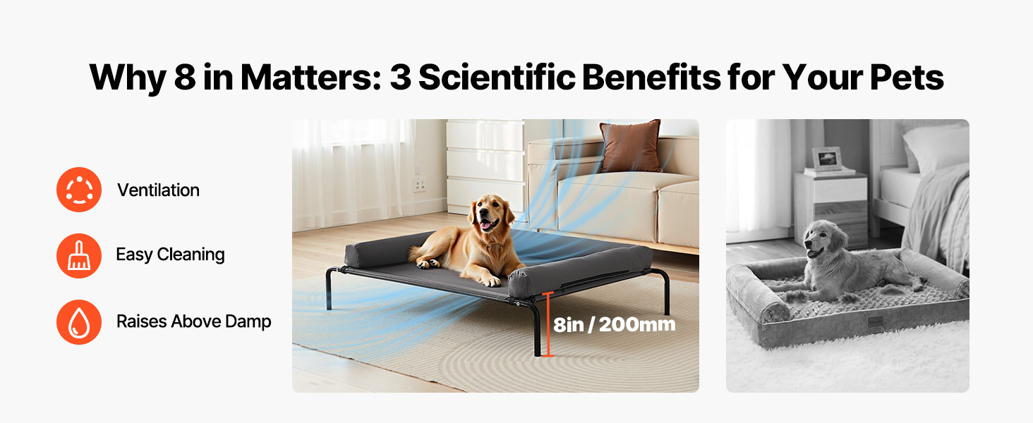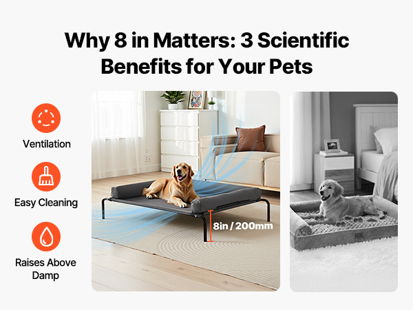 - Tool-Free Quick Assembly: Comes with clear assembly instructions, allowing you to set it up in just 10 minutes. New pet owners can easily assemble it too. The 8 in / 200 mm elevated height keeps your pet off the ground, isolating them from moisture, dust, and cold temperatures. It provides cooling airflow in the summer and can be paired with a blanket in winter for warmth