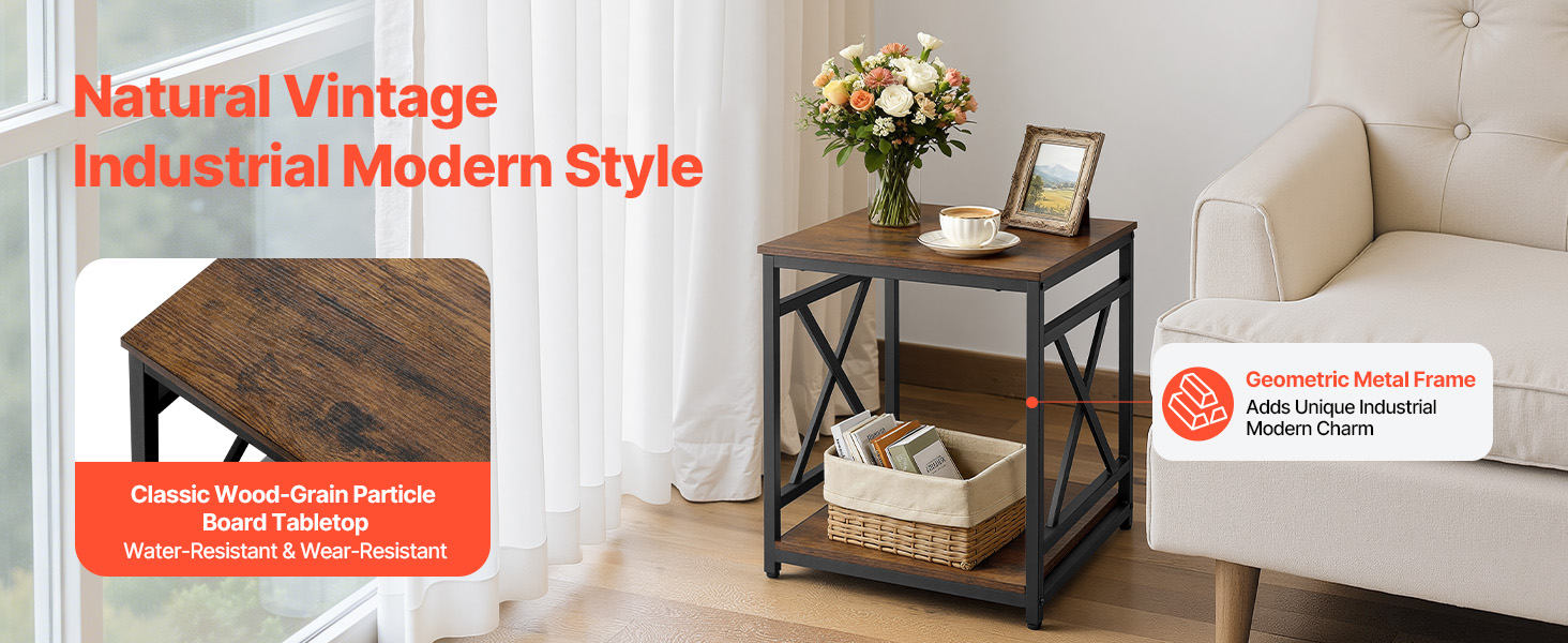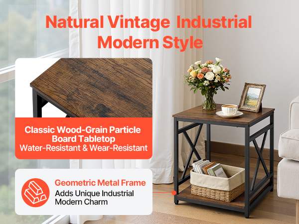 - Modern Industrial Style: Featuring a natural wood-grain tabletop with a smooth, refined texture, this end table is crafted with a geometric metal frame for a unique industrial touch. It's ideal for enjoying relaxing moments with friends and family.