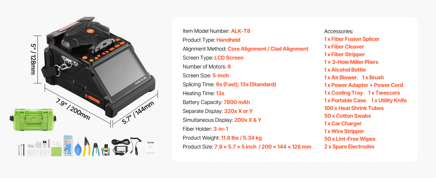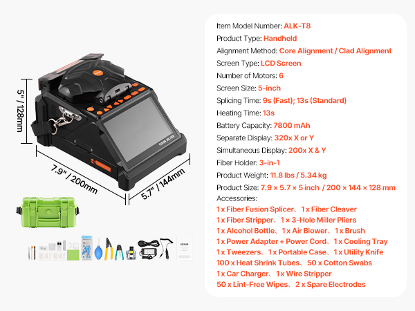 • All-in-One Kit: Keep your accessories neatly organized with the portable case. The optical fusion splicer kit includes a fiber fusion splicer, fiber cleaver, fiber stripper, 3-hole miller pliers, alcohol bottle, air blower, cooling tray, 100pcs heat shrink tubes, brush, 50 pcs cotton swabs, 2pcs spare electrodes and other essential tools.