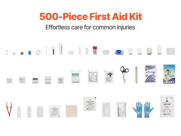 • 500-Piece Professional Survival Kit: Packed with various medical supplies and tools, including elastic bandages, gauze, alcohol pads, and emergency blankets. This first aid kit covers all your common injury and accident needs