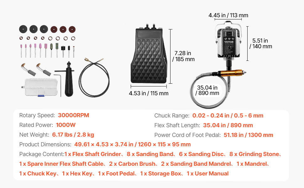 This 1000W flex shaft grinder, featuring a premium copper motor and up to 30,000 RPM, is ideal for carving, polishing, drilling, and more. The 3-jaw chuck and 35-inch extended flexible shaft add convenience and flexibility to every project. Ideal for craftsmen and DIY enthusiasts alike!