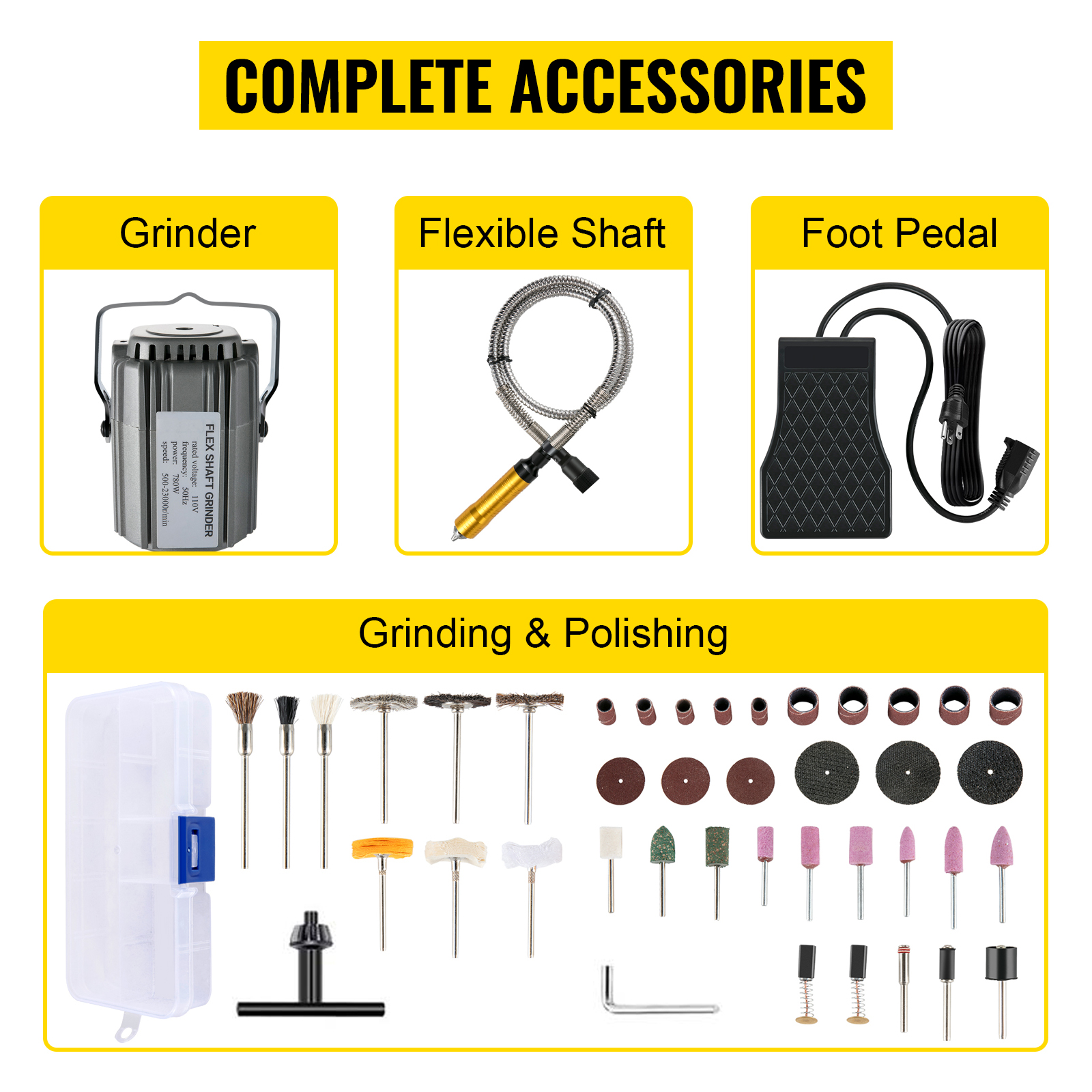 Our flex shaft grinder comes with a complete accessory kit to perform numerous grinding, sanding, polishing, deburring, and cleaning tasks. With a strong copper motor, high-precision chuck, and variable speed foot pedal, the tool is suitable for different processing places and materials, such as metal, wood, stone, jewelry, etc. High performance and versatility have all come together to bring you a high-quality shaft grinder. Get ready to grind away projects and get things done right with VEVOR.