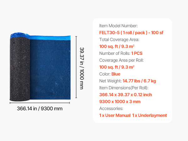 - Large Area Coverage: This floor underlayment covers 100 sq. ft / 9.3 ㎡ per roll (366.14 x 39.37 x 0.12 inch / 9300 x 1000 x 3 mm). Ideal for large installations, it reduces construction time and material waste for quick, efficient flooring completion.