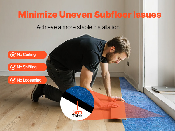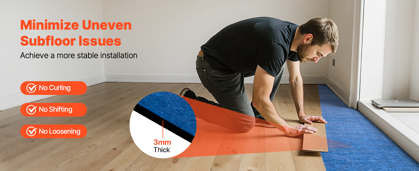 This thick underlayment effectively fills gaps and uneven areas, avoiding curling, shifting, and loosening of the floor. It ensures a firm, stable surface that enhances durability and avoids damage from an uneven base.