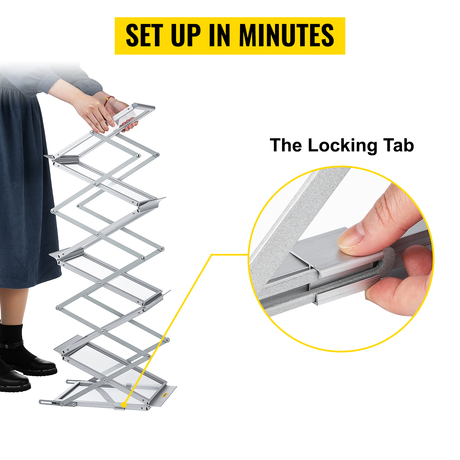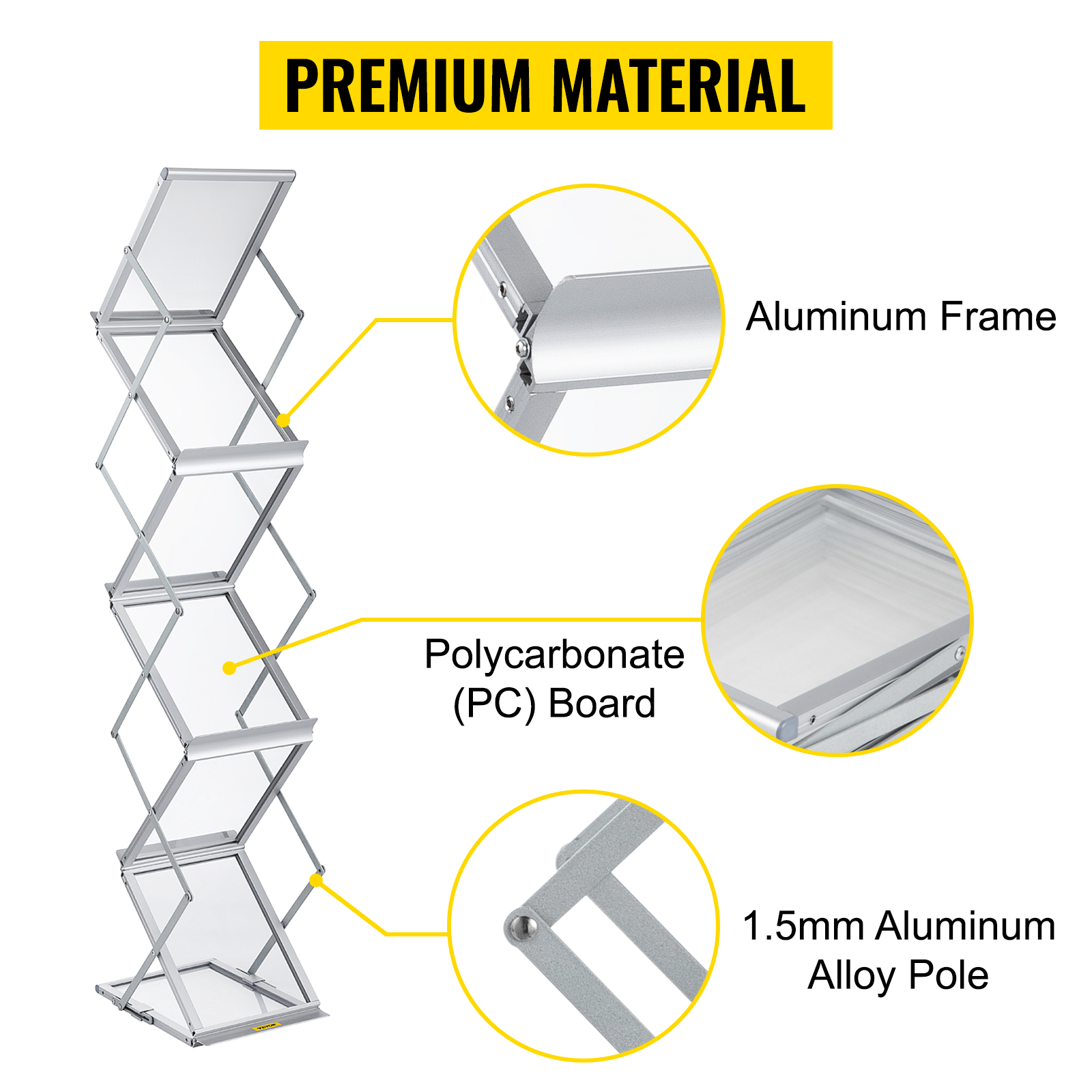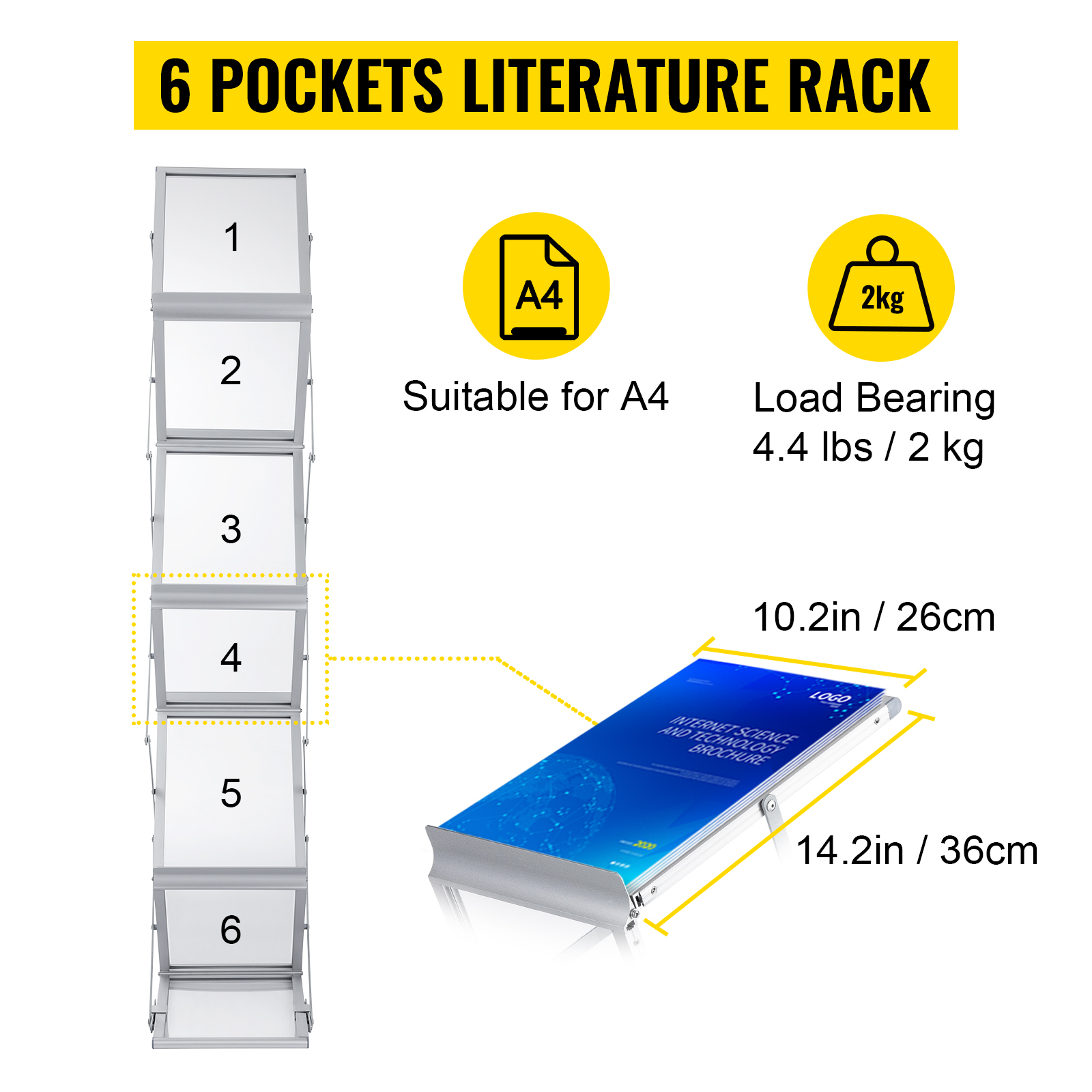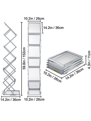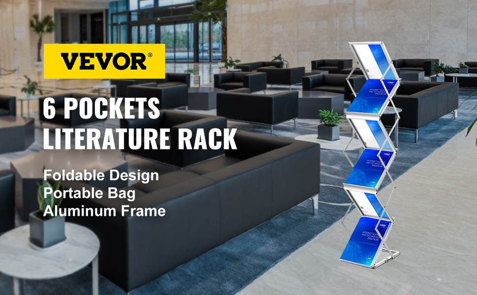 - Quality Craftsmanship, Lasting Durability: VEVOR 6-pocket foldable brochure display stand is mainly crafted from high-quality aluminum alloy, ensuring durability and resistance to rust, deformation, and fading. With a stable base, it stands firm and exhibits excellent wind resistance, perfect for both indoor and outdoor use.