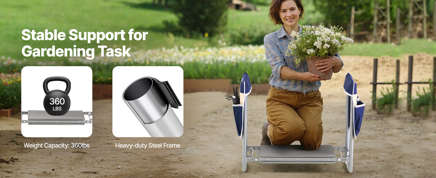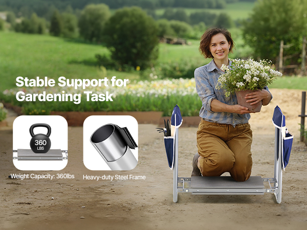 • Supports Up to 360 lbs: Built with high-strength A3 steel and a powder-coated finish, this garden kneeling stool ensures stability and durability. It supports up to 330 lbs, making it ideal for gardening, household chores, and any activity requiring strong support.