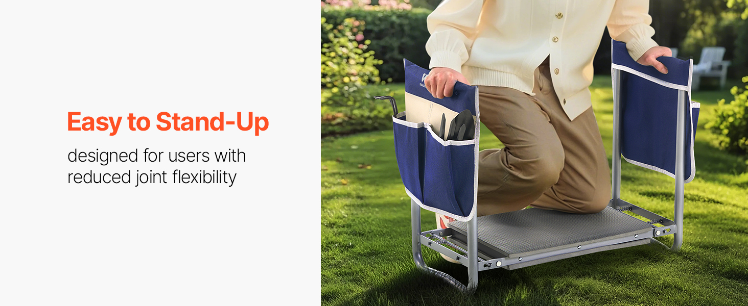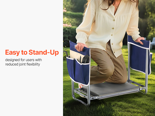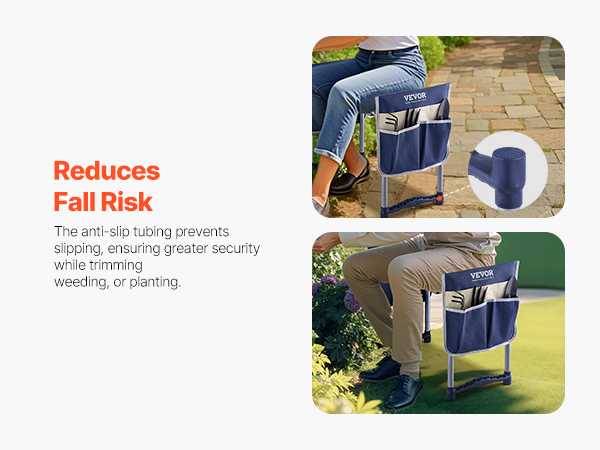 • Easy to Stand Up: The garden kneeler and seat side handles that offer additional support, making it effortless to rise from a kneeling position. Thoughtfully designed for seniors or anyone with limited joint mobility, it helps prevent joint strain and discomfort, allowing gardeners to work more comfortably and easily. The anti-slip tubing at the bottom enhances grip, ensuring safety during trimming tasks, whether on muddy ground or smooth pavement.