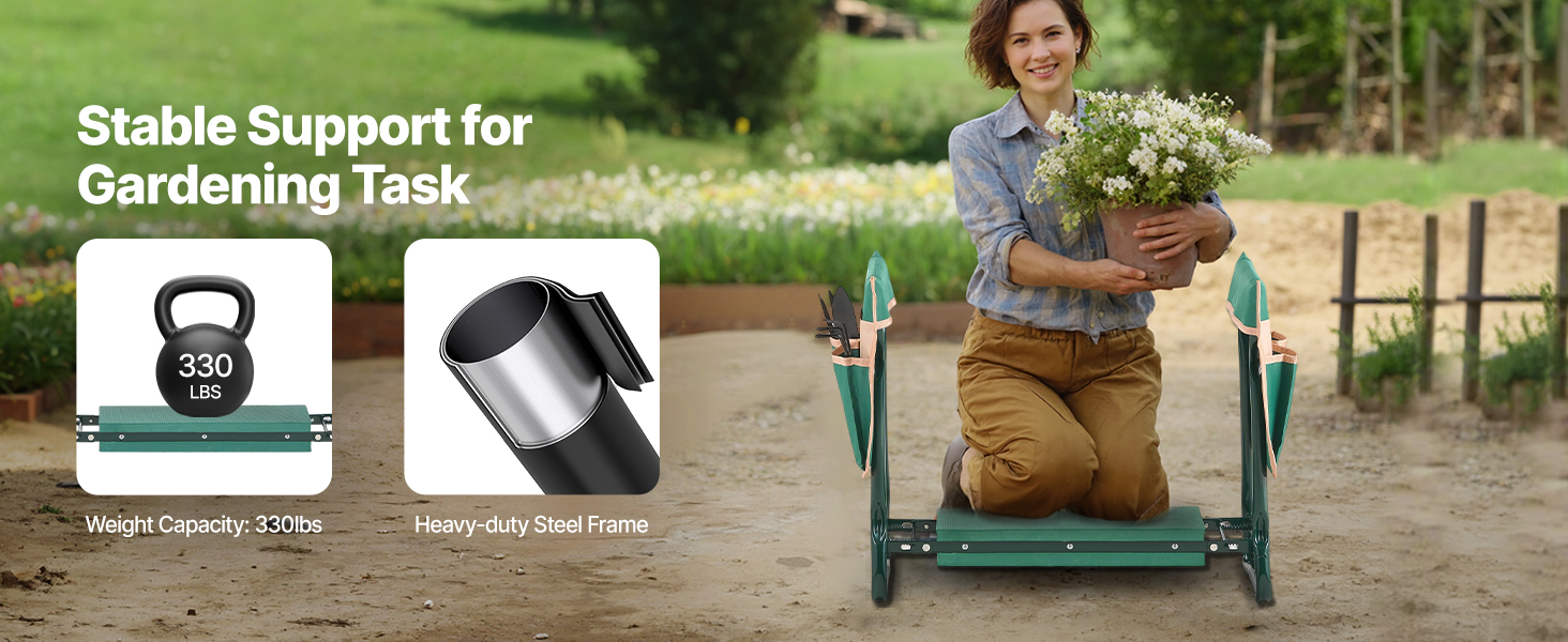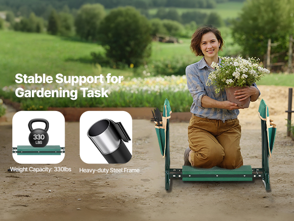 - Supports Up to 330 lbs: Built with high-strength A3 steel and a powder-coated finish, this garden kneeling stool ensures stability and durability. It supports up to 330 lbs, making it ideal for gardening, household chores, and any activity requiring strong support.