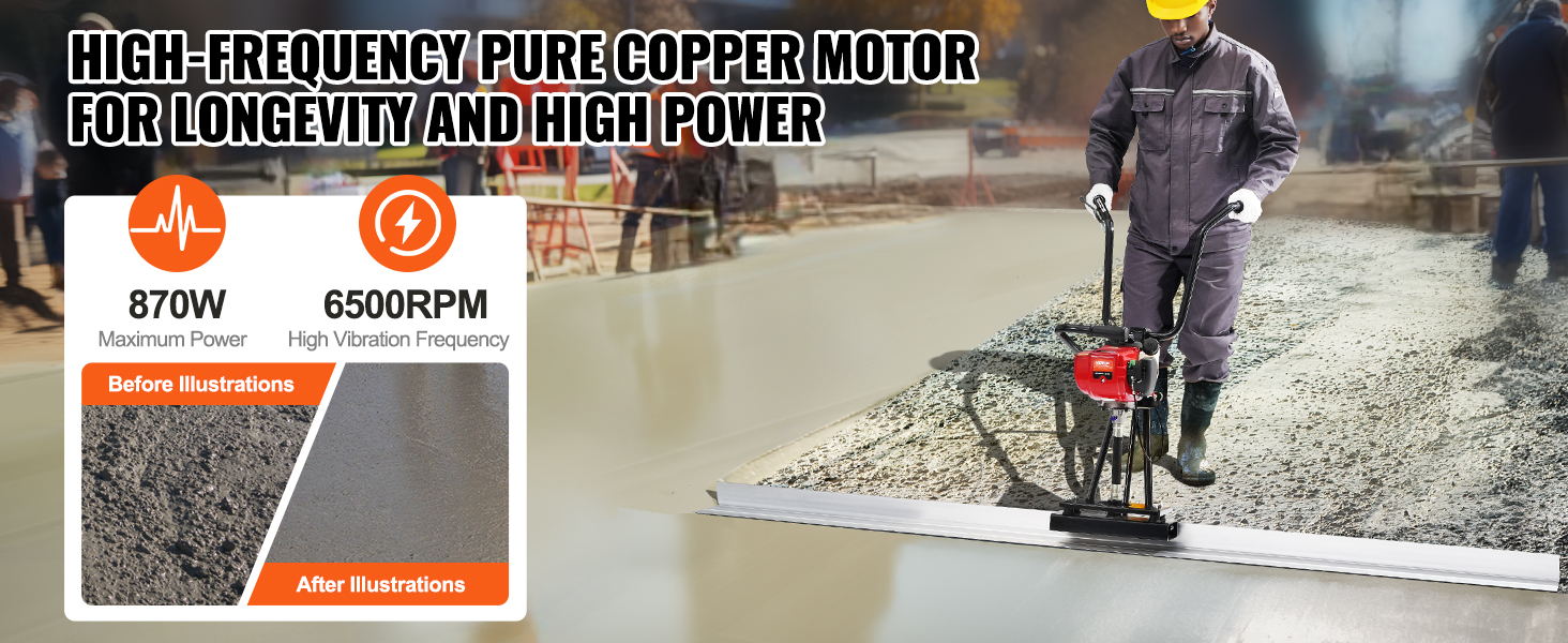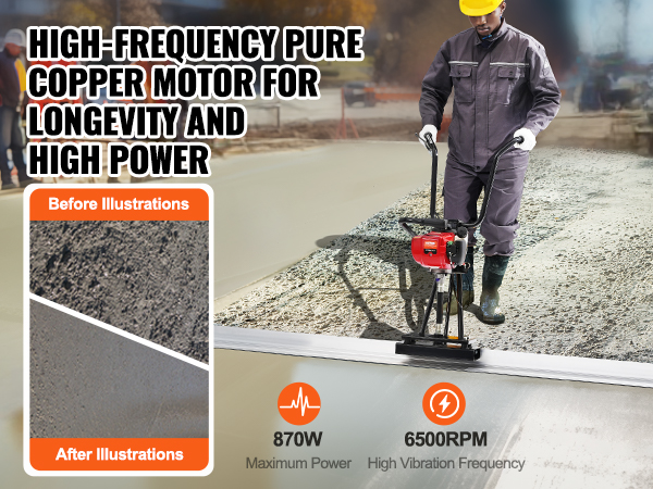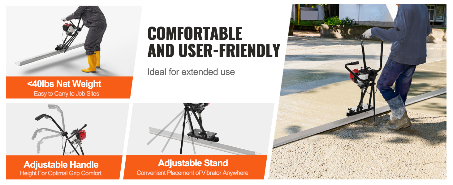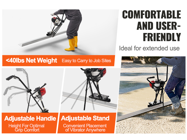 - Effortless Operation: Adjustable handle height from 28.7 to 41.7 inches / 730-1060 mm. Lightweight design make construction efficient and comfortable. Strong vibration eliminates deep-seated bubbles, making the concrete surface smoother and more level, improving work efficiency and quality.