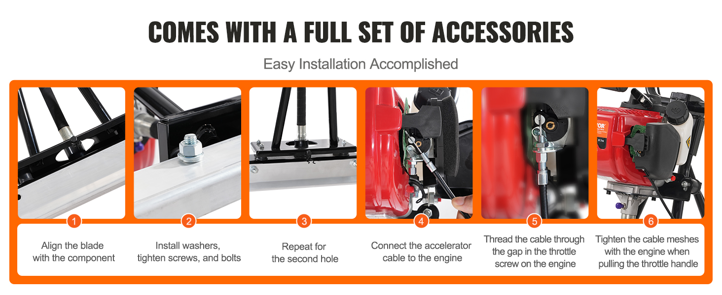 - Easy Installation: This power screed has completed most of the installation before transportation. After receiving the goods, only simple assembly is required to use it immediately, bidding farewell to cumbersome installation steps, saving time and effort.