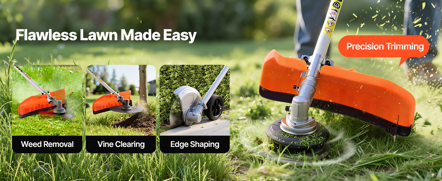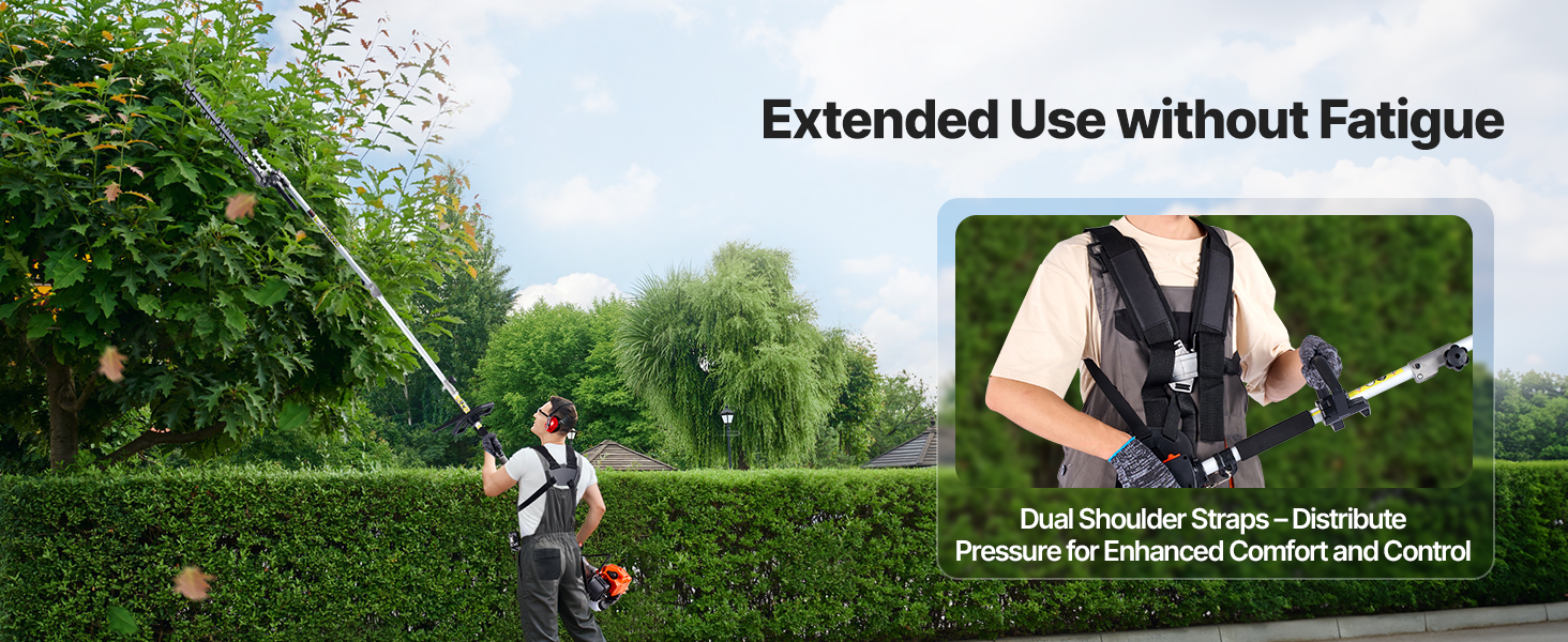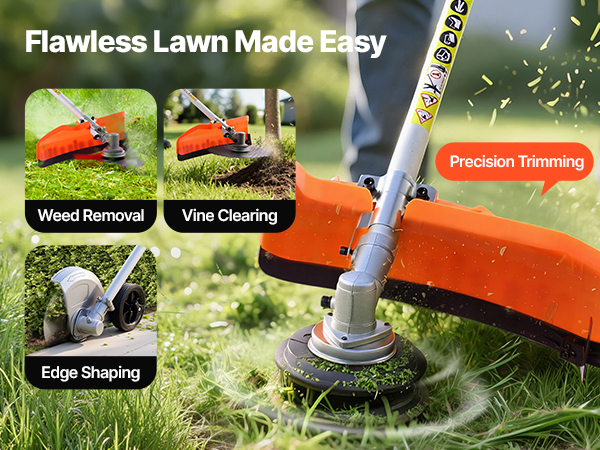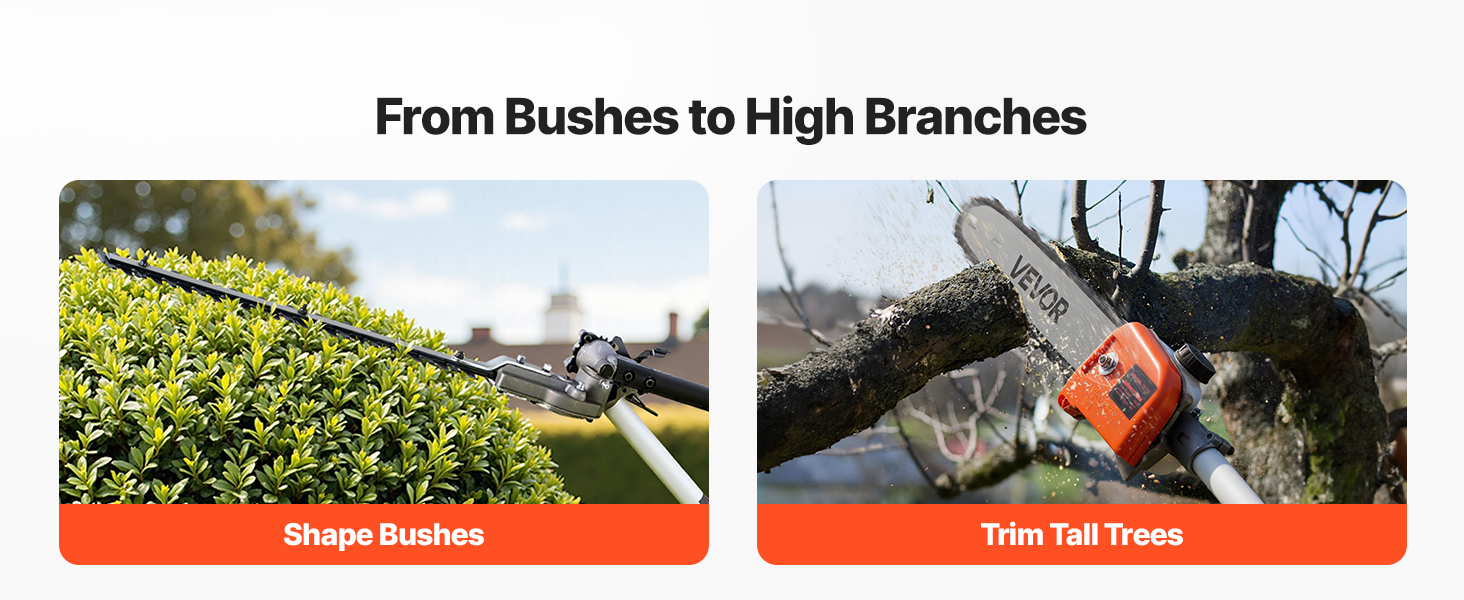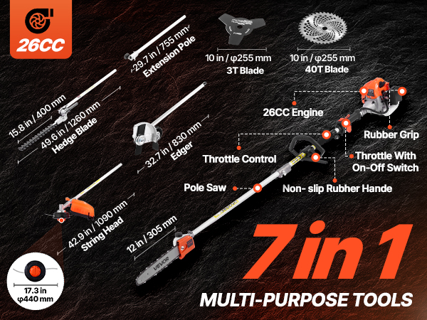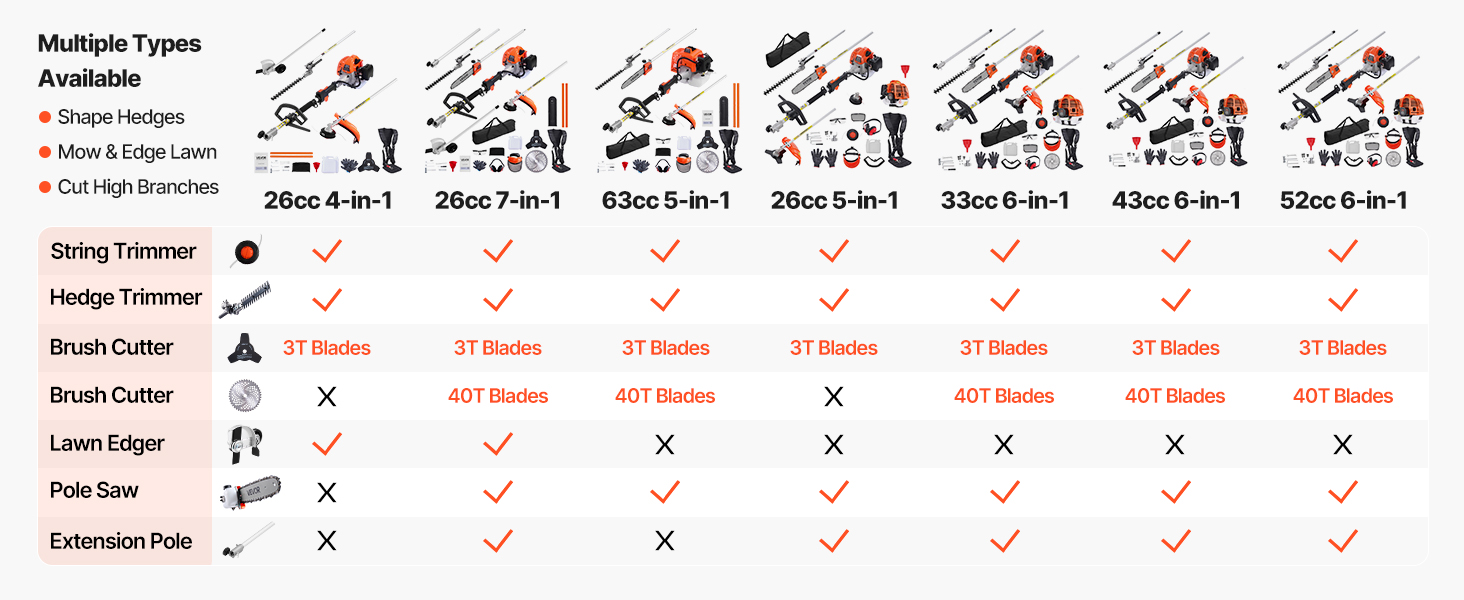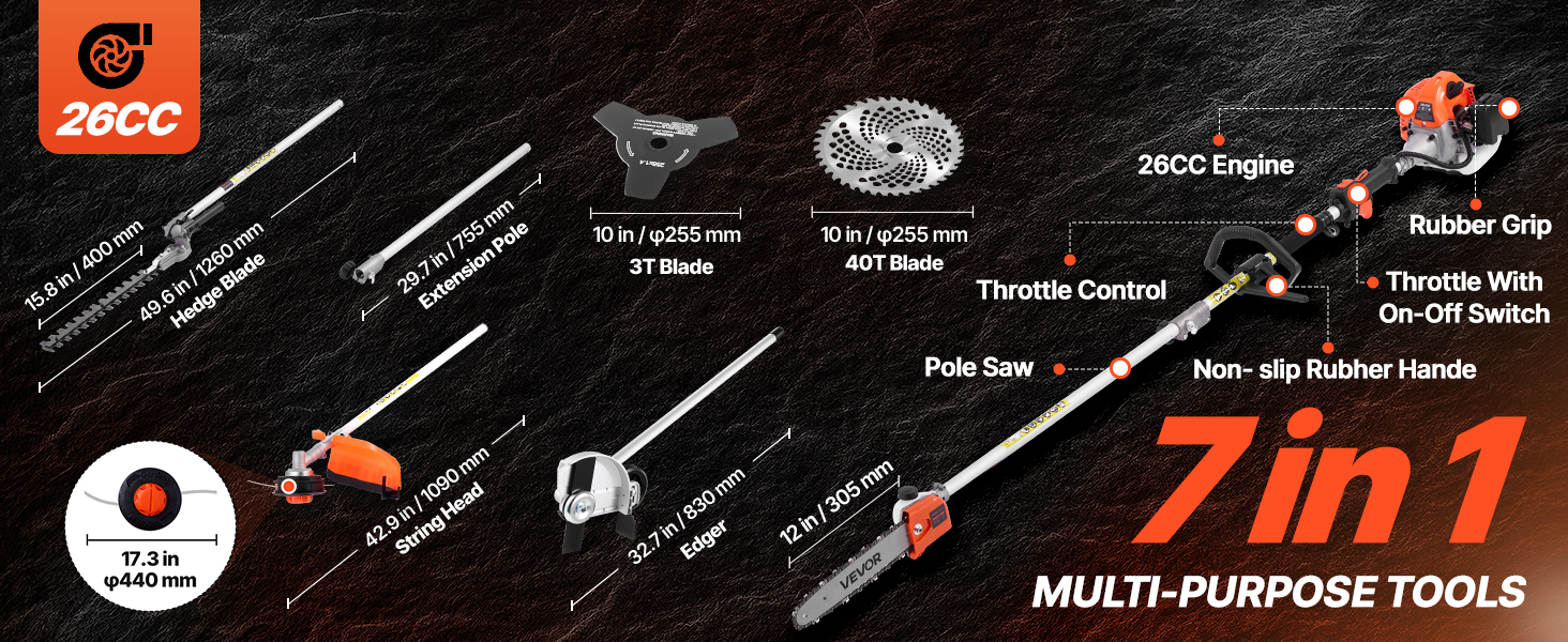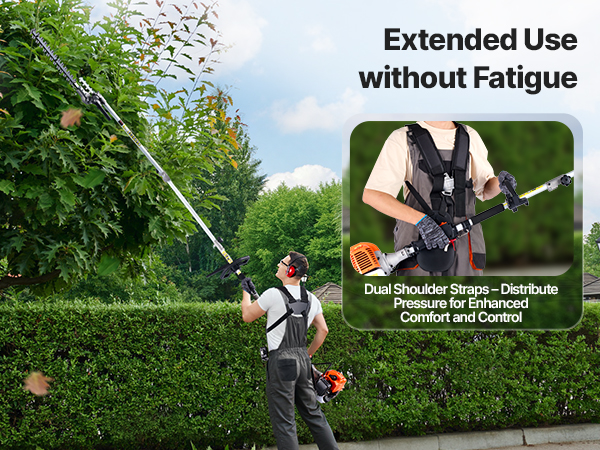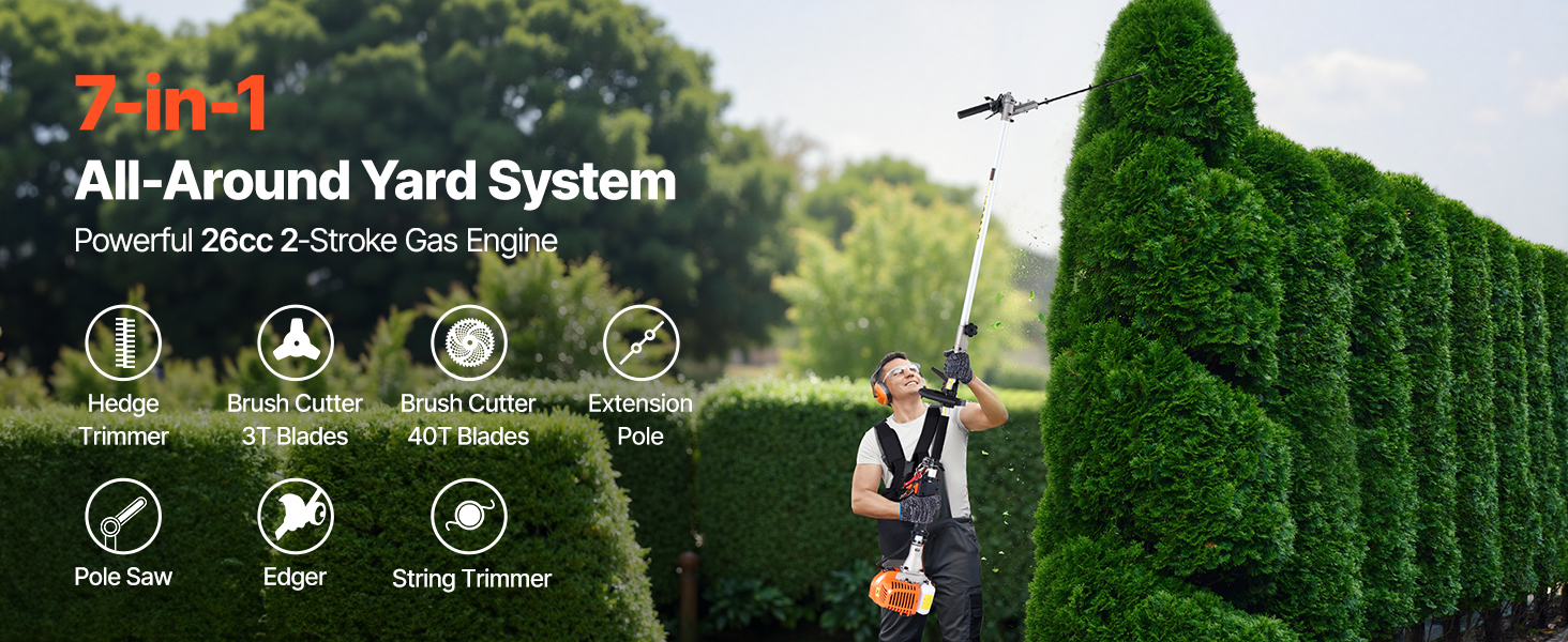 • 7-in-1 Multi-Function: Our gas hedge trimmer includes a hedge trimmer, string trimmer, brush cutter (3T & 40T blades), edger, and pole saw, covering all yard tasks such as lawn edging, thick branch cutting, and high hedge trimming.
